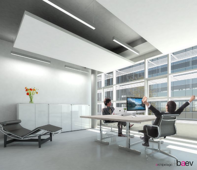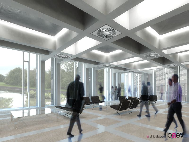 Articulés aux tours d'entrée, des plateaux de bureaux, posés comme des poutres au-dessus des socles. Orientées nord-sud, les façades des bureaux profitent d'un maximum de lumière naturelle tout en se protégeant efficacement contre les surchauffes.