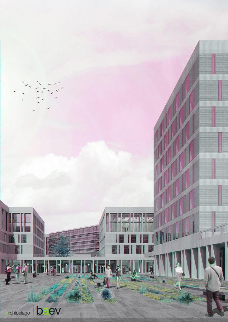 Au centre du site, par dessus la voirie et à la jonction entre les niveaux des deux socles, s'implante une place publique, ouverte sur un bord. 5 tours s'élèvent autour de la table, donnant un visage à chaque pôle. Une sixième tour plus importante consacrée à l'hôtel vient se poser en signal en bord de place.