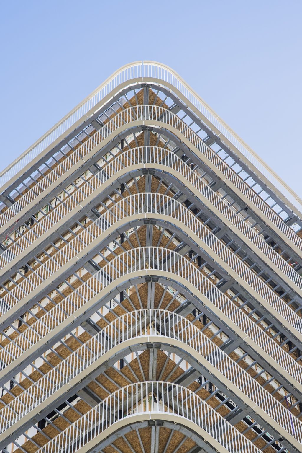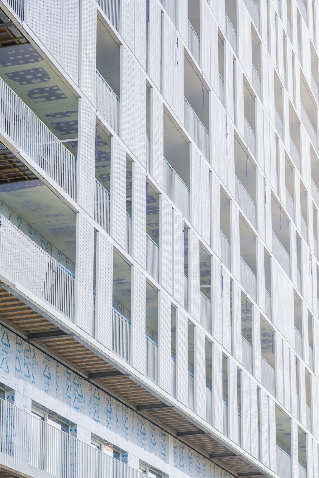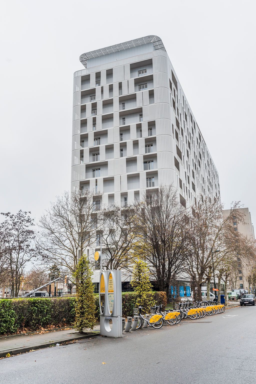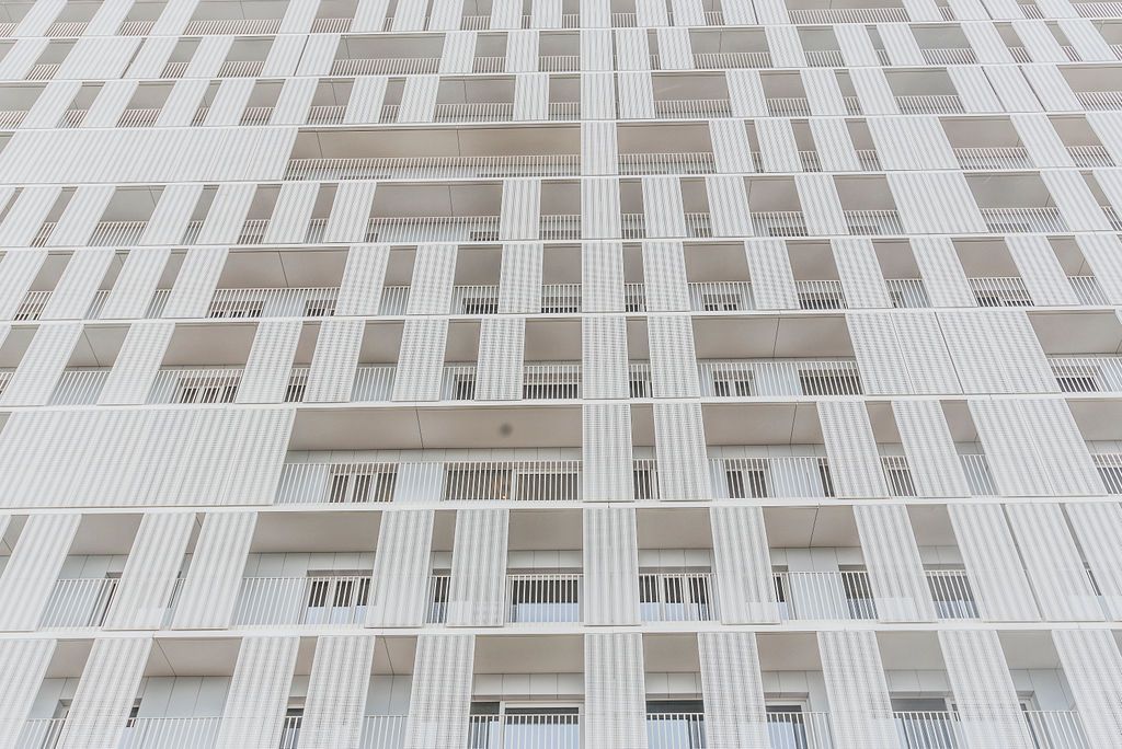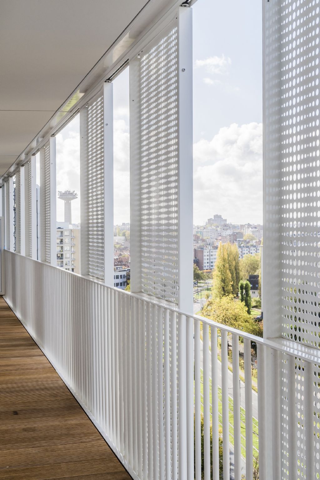 Leopold Views est un développement de 21.000 m2 hors sol qui vise une qualité de vie supérieure et qui promeut le « vivre ensemble ». Il propose 201 appartements, du studio aux 3 chambres. Les volumes proposés sont simples et fluides. Comme une ruche à stratification horizontale, l’activité à l’intérieur de chaque alvéole/appartement contribue à l’identité forte de l’ensemble de l’immeuble. Dans un souci de limiter l’empreinte écologique, la structure existante en béton est maintenue mais totalement réinventée au moyen d’une façade préfabriquée en bois, puis habillée de métal blanc. La circulation à chaque étage s’organise autour d’un bloc ascenseur central et s’étire vers les extrémités proposant de magnifiques séquences visuelles. Les structures portantes et les techniques sont concentrées permettant une grande flexibilité des cloisonnements non porteurs. Pour susciter l’envie aux habitants de vivre dans une tour, architectesassoc a conçu pour chaque appartement une terrasse profonde sur toute sa largeur, mettant ainsi l’accent sur cet espace de transition entre intérieur et extérieur. Chaque lieu de vie devient donc un cocon dans lequel la luminosité, la libre circulation, la blancheur apaisante et le plaisir d’y être jouent un rôle essentiel. Dans l’espoir de créer une communauté entre celles et ceux qui habitent Léopold Views, architectesassoc a proposé dès le concours des espaces partagés dès l’entrée. La grande entrée traversante avec conciergerie, communique de façon fluide avec le local vélos, tous deux baignés de lumière avec 4m10 sous plafond. En toiture, deux grandes terrasses panoramiques et une petite salle de fête, dotée d’une kitchenette surplombent la ville. Une nouvelle façon de vivre peut ainsi prendre racine.