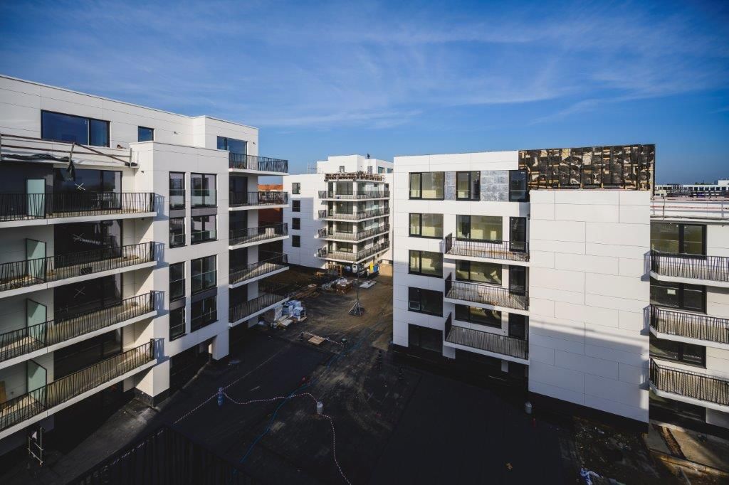 Le projet a été réalisé par l’entreprise générale de construction Louis De Waele en association momentanée avec l’entreprise générale Socatra. Le projet s’étendait donc sur deux communes et se divisait en deux phases distinctes – une par commune – mais avec un permis de bâtir global. La première phase, à Schaerbeek, compte 86 unités de logement et un rez-de-chaussée commercial. Elle est livrée et habitée depuis juin dernier. La seconde, à Evere, comptera 114 unités de logement et est en voie d’achèvement, prévu pour avril-mai 2020. Chaque phase du chantier a duré un peu moins de trois ans, ce qui est peu compte tenu de l’ampleur du projet.