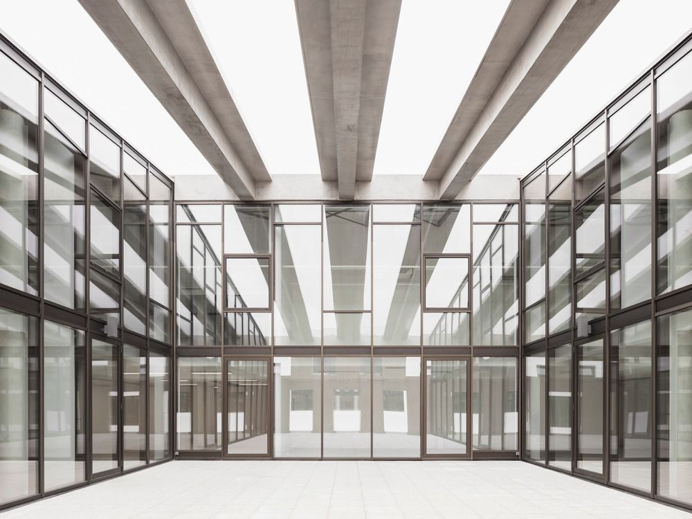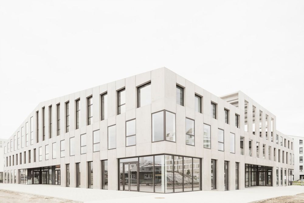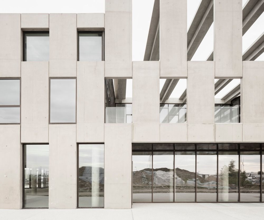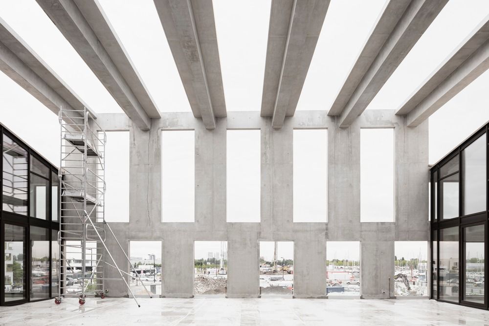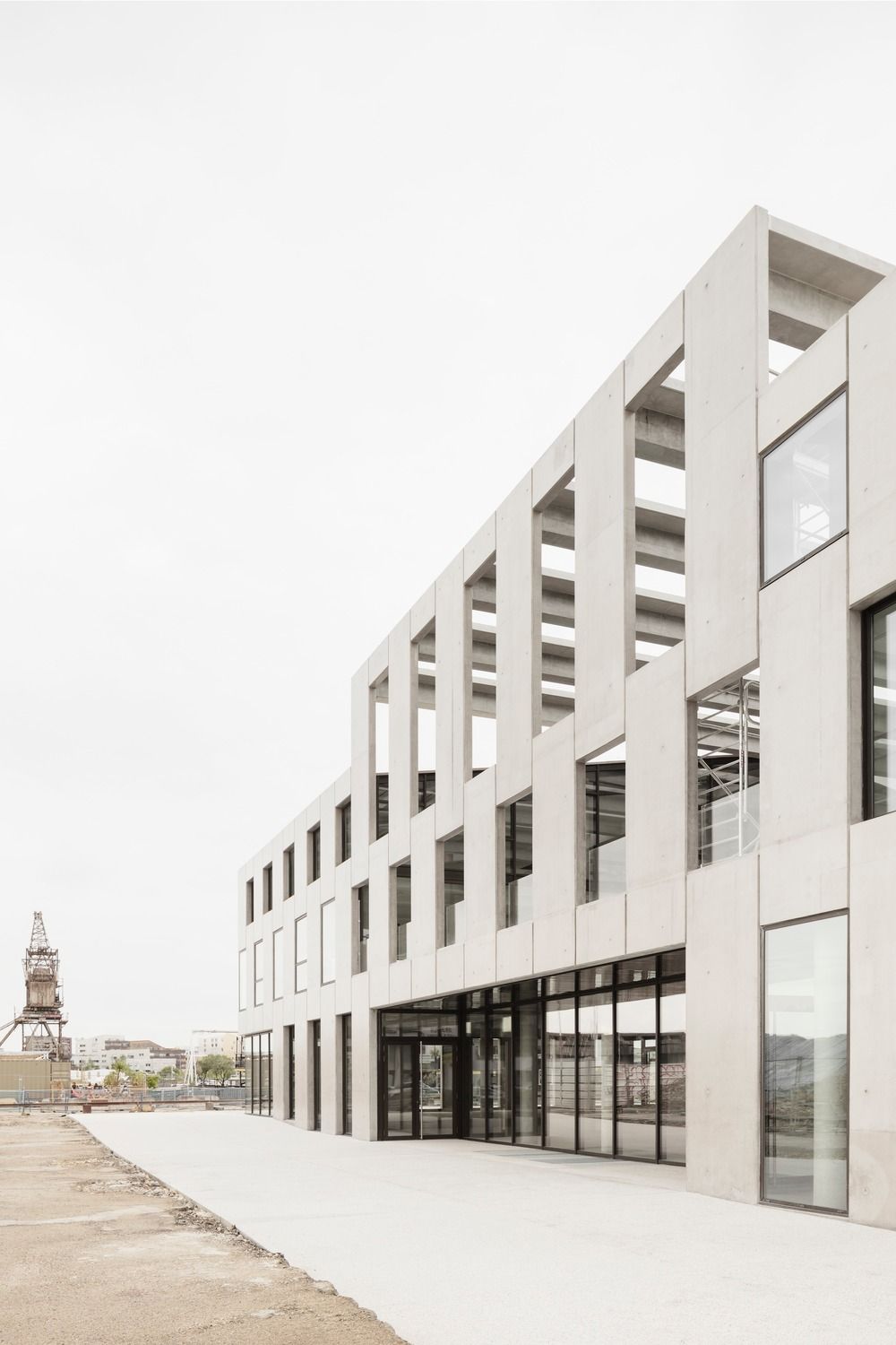 Sa spécificité réside dans un positionnement bicéphale : il s’adresse avant tout à l’espace public et constitue une vitrine de premier plan pour les commerces et bureaux qu’il abrite. La traduction se fait au travers d’une générosité spatiale, tant à l’intérieur avec des doubles hauteurs partielles, qu’en extérieur avec les deux patios et les larges ouvertures. La coque en béton vient rappeler le vocabulaire de la base sous-marine en vis-à-vis, et traduit une matrice flexible pouvant articuler tout type de programme. Les ouvertures, parfois à nu, d’autres en retrait, créent une variation dans cette grille régulière.