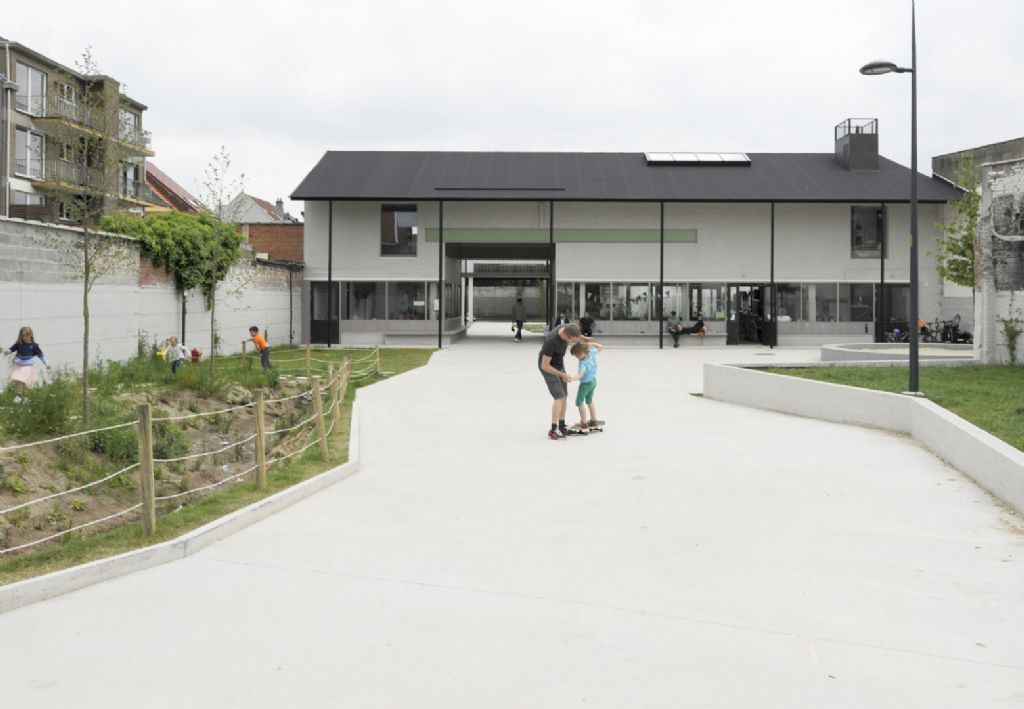 Le site Standaert est une initiative bottom up au cœur du quartier densément peuplé de Ledeberg. Le projet de ae-architecten, Carton123 architecten et murmuur architecten crée un espace de rencontres sous la forme d’un parc public et d’une maison de quartier. Le grand hangar à ossature métallique a été rénové et fait à présent office de lieu de rencontres avec quatre ateliers/espaces polyvalents pour accueillir un grand nombre d’activités. De plus, un grand auvent peut abriter les activités ne nécessitant pas de chauffage comme les fêtes de voisinage, les petits marchés, certains spectacles… L’architecture explore la frontière entre intérieur et extérieur. Des bancs adossés à la menuiserie offrent un espace de rencontre sous le vaste auvent. Etant l’un des rares lieux de rencontres à Ledeberg, le site Standaert remplit déjà une cinquantaine de fonctions très accessibles, pour tous les âges et toutes les communautés.