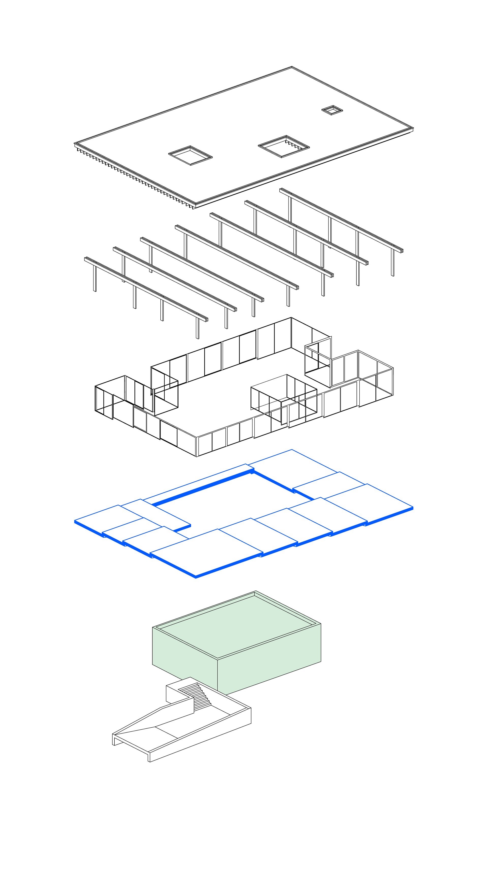 La maison existante est composée d'un empilement de dalles de sol en béton qui serpentent autour de la maison comme une spirale flottante, une promenade architecturale. Par le biais du parking souterrain, on peut entrer dans la maison par une porte d'entrée au milieu du bâtiment. À partir de là, une spirale traverse tous les espaces de la maison. La hauteur des plateaux en béton est proportionnelle au besoin de confidentialité de chaque pièce.
