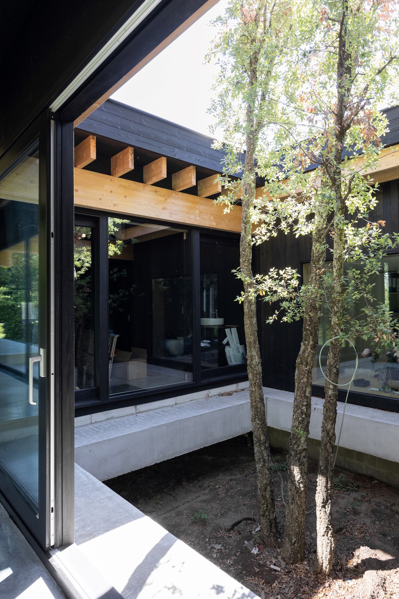 Le toit a été structurellement construit avec des poutres porteuses en bois verni en contraste avec le toit noir. La façade vitrée de la maison permet aux patios de trouver leur place avec des plantes indigènes. Le résultat ? Une maison ouverte et paisible avec différentes perspectives offrant une expérience ultime grâce à la richesse verte environnante. L'architecture est pratiquement invisible car elle se fond dans la nature.