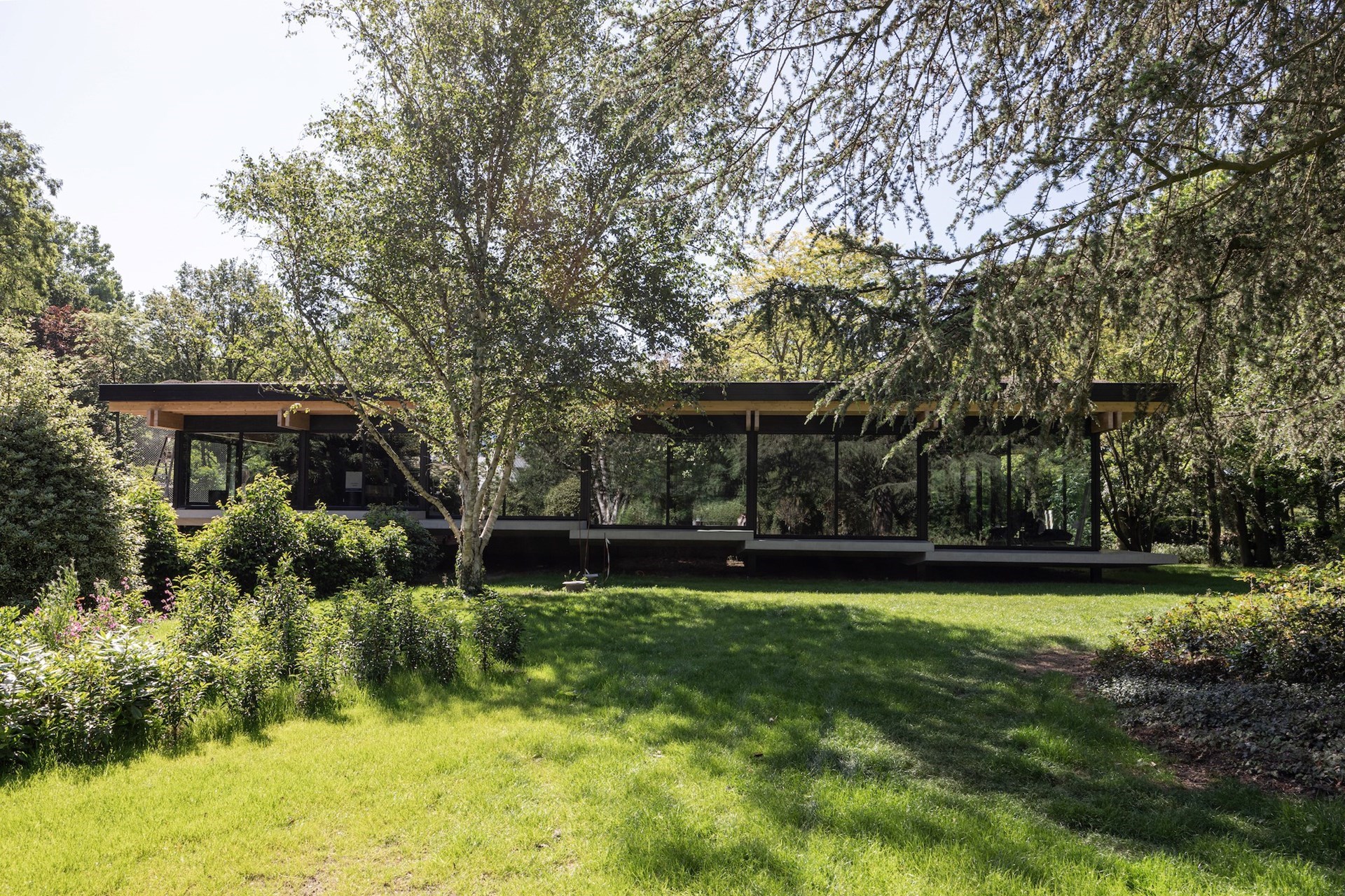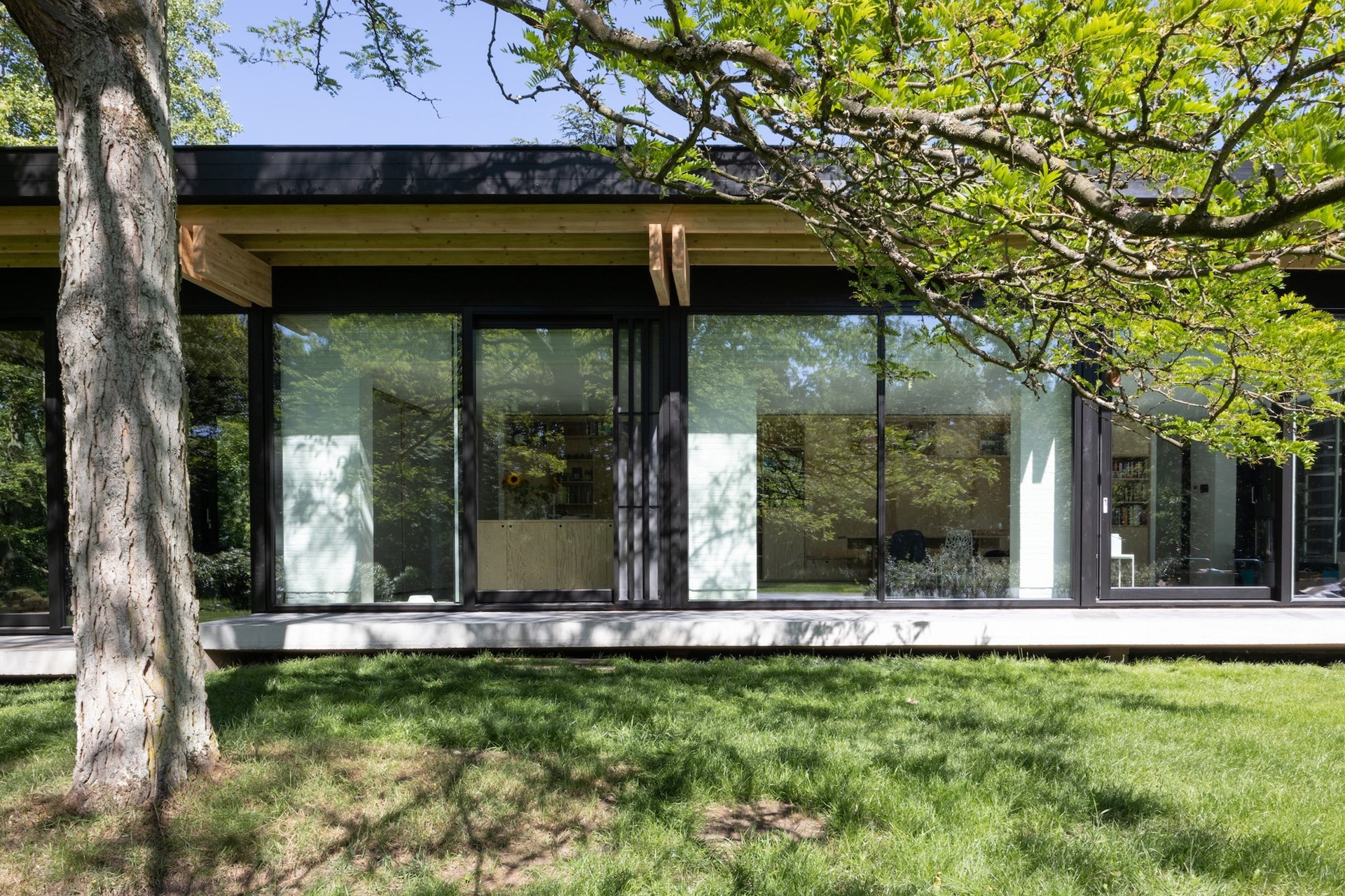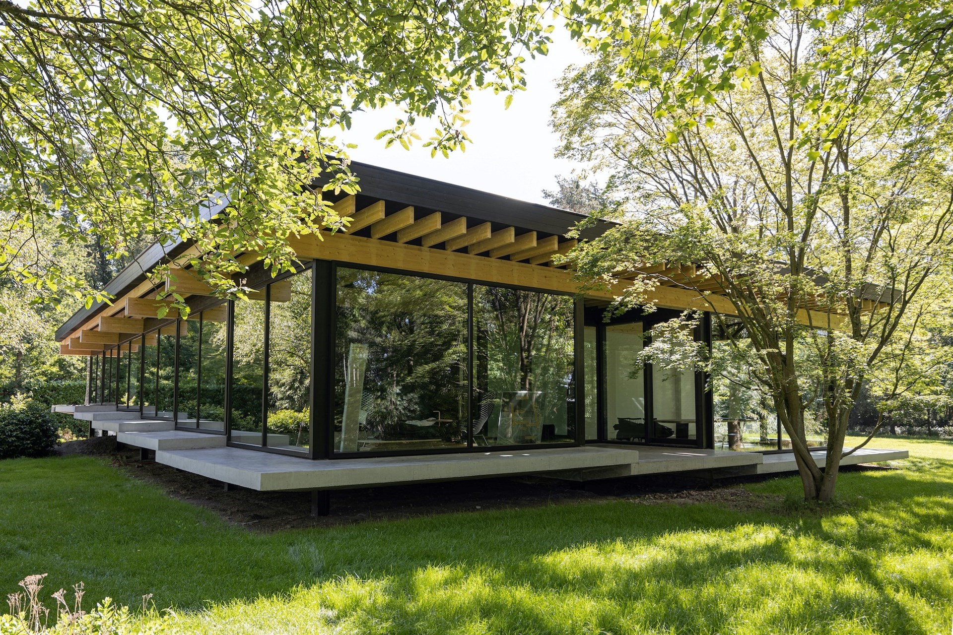 dmvA a réalisé la House VMVK II sur la base de trois piliers durables. Tout d'abord, autant que possible de la villa existante a été préservé et intégré dans le nouveau design. Le volume est resté blanc et a été enveloppé de verre. De plus, le concepteur a limité l'impact sur le sol en faisant flotter les éléments d'extension sur un plateau en béton, préservant ainsi le sol. La structure de construction sur le plateau est en bois. Le squelette en bois est entièrement démontable et circulaire.