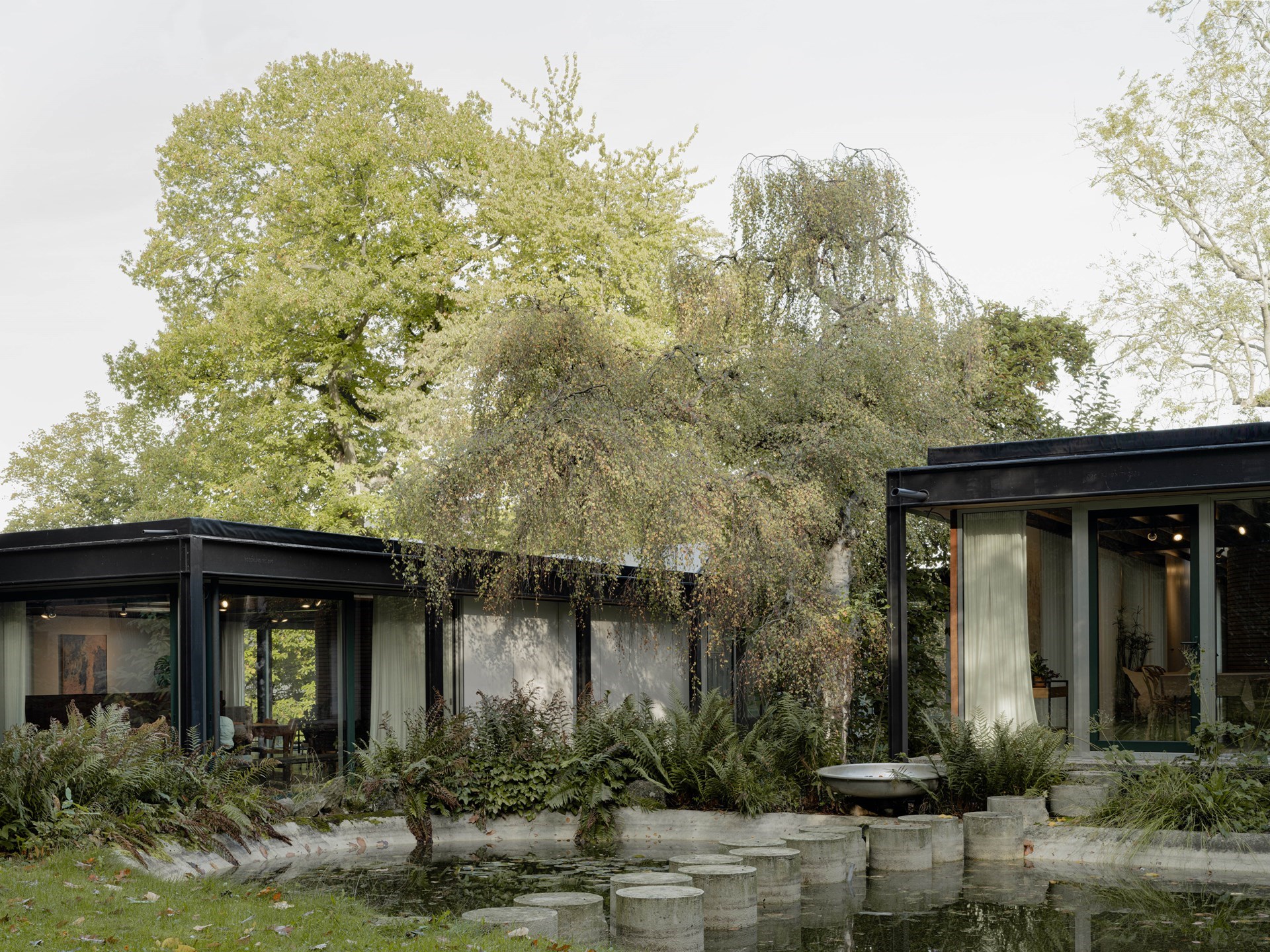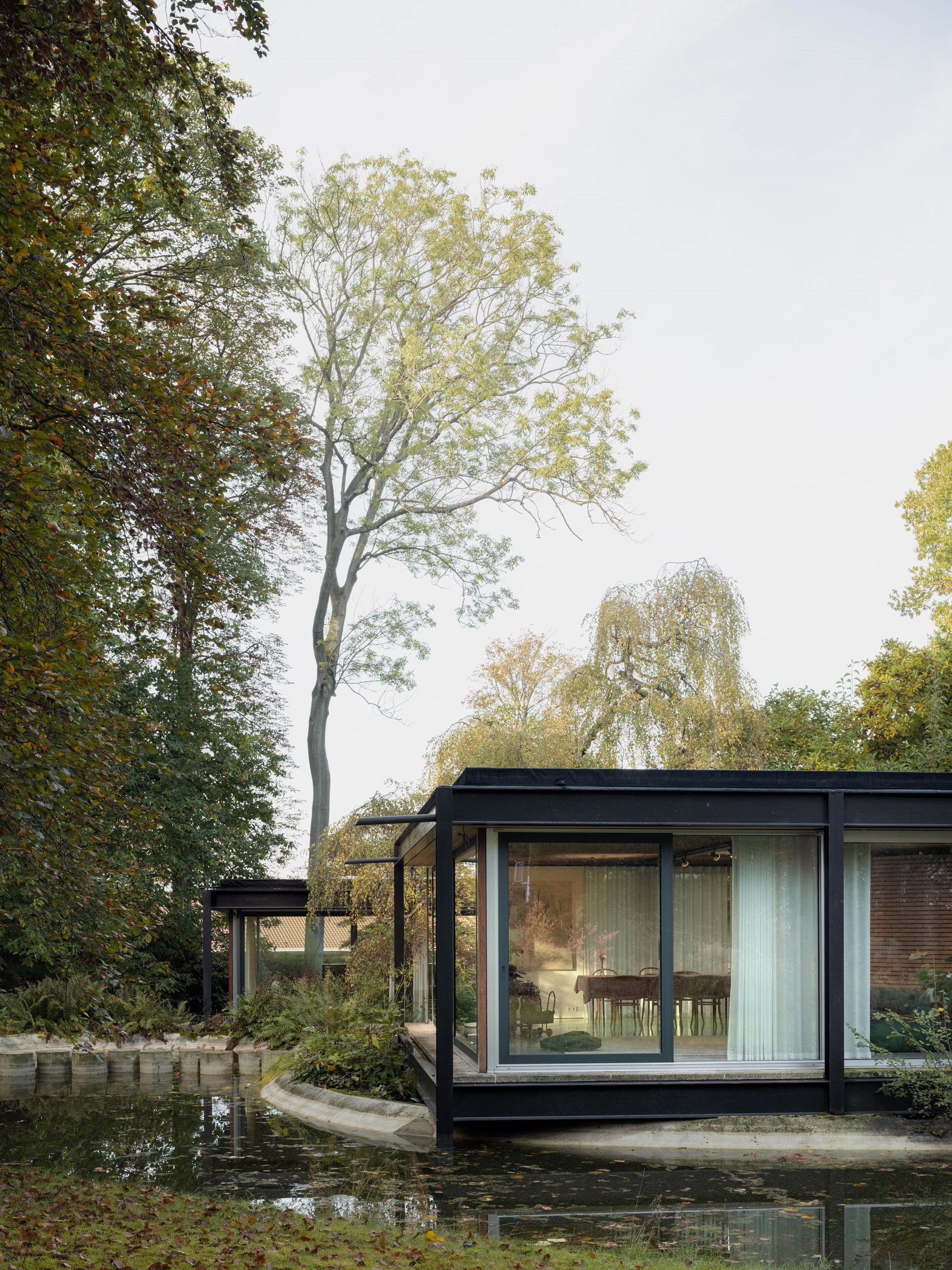 En raison de la typologie inhabituelle de deux pavillons identiques reliés par un hall en verre, le bâtiment se prête à une division simple. L'objectif de Fijn atelier et anne-valérie de mûelenare était de créer deux maisons intégrées dans la conception globale. Elles respirent la même atmosphère et sont complémentaires, chacune avec ses propres accents et orientation.