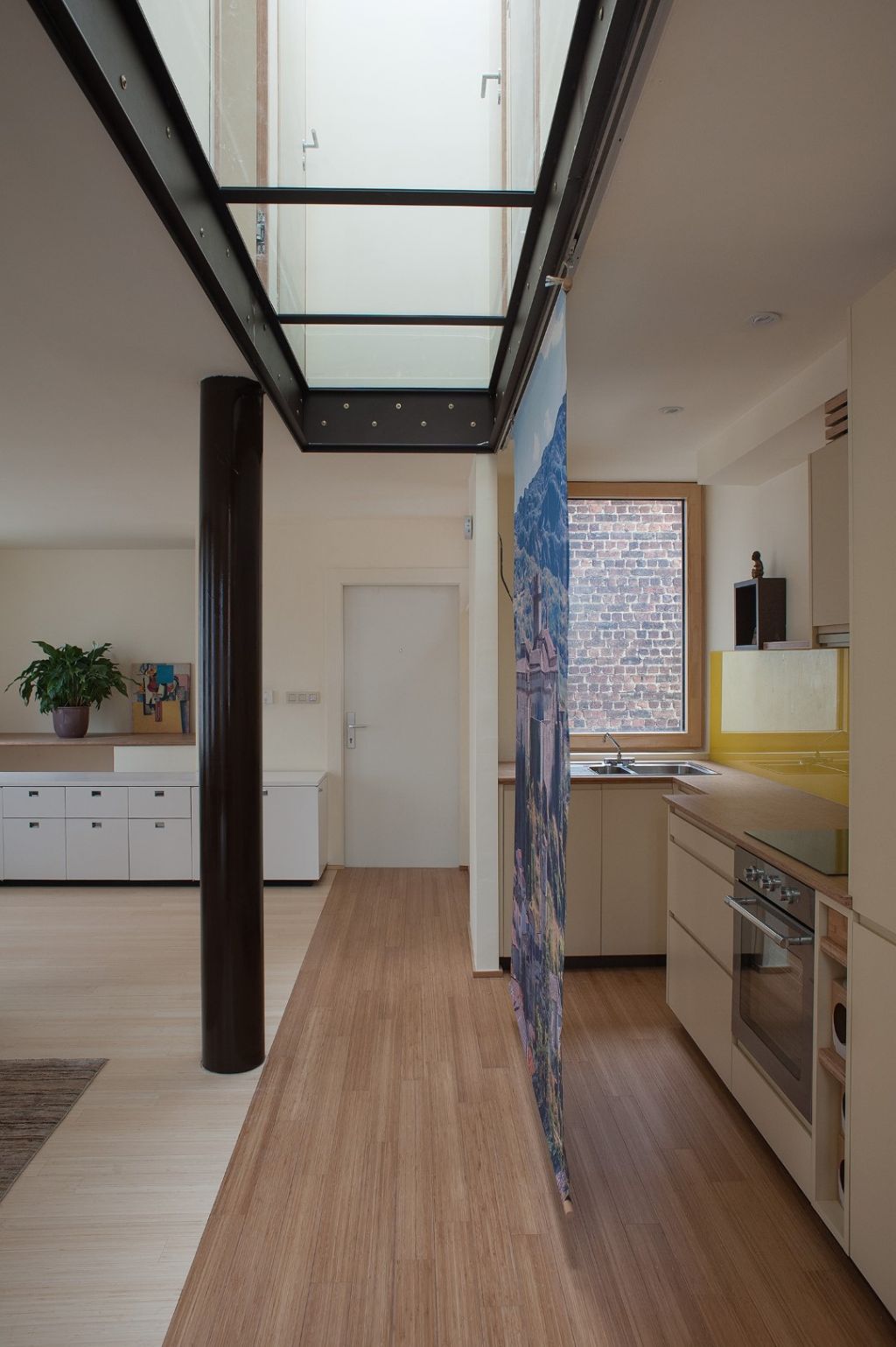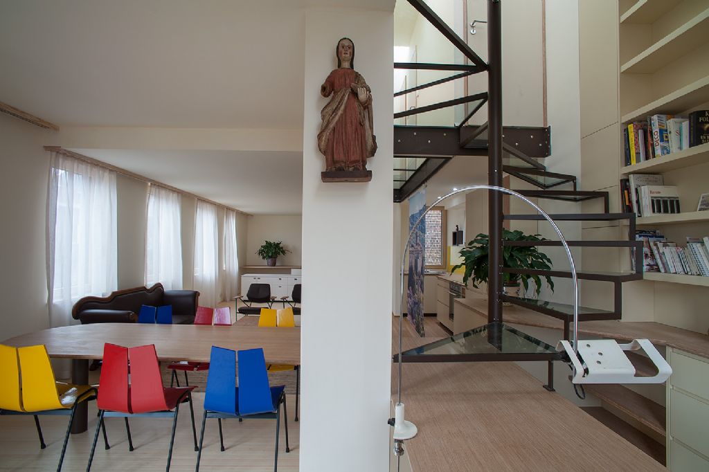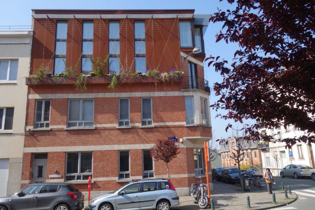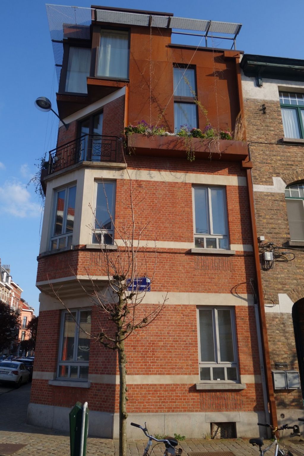 L’immeuble, à Ixelles, est situé au croisement d’une avenue et d’une rue en pente descendante. Son propriétaire, l’architecte Thierry Lamy, a décidé d’occuper – et d’agrandir – un appartement situé au-dessus de ses bureaux. « Il faut cesser de se désirer ailleurs », explique-t-il. « Faire des navettes incessantes entre son lieu de vie et ses activités me paraît incohérent. Jusqu’au début de l’industrialisation, les hommes exerçaient leur métier à côté de leur lieu de vie. Aujourd’hui, cela n’a plus de sens de construire une villa, même passive, loin de son lieu de travail, dont les temps d’accès et la pollution engendrée par les déplacements équivalent à la consommation d’une villa peu isolée. »