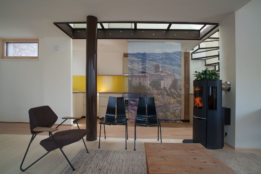 Quant aux cendres du poêle à bois (disposant de sa propre arrivée d’air frais) elles serviront d’engrais pour les bacs à plantes. Un exemple de plus de la réflexion permanente et de l’efficacité de l’architecte…