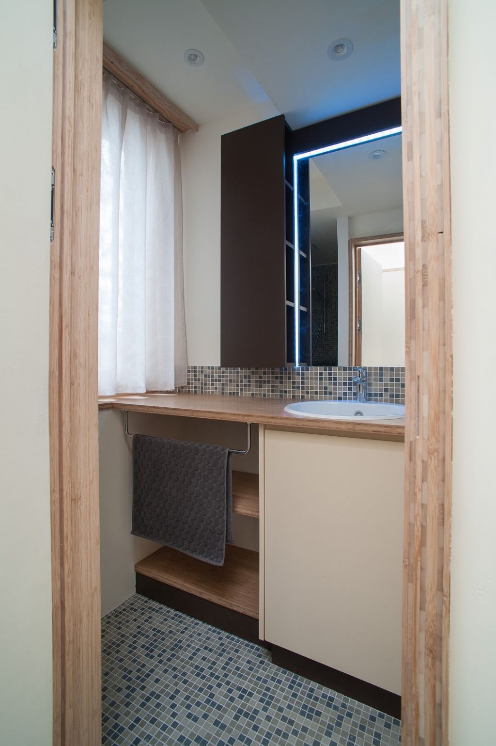 Malgré les dimensions modestes, on se sent bien accueilli dans cet appartement en raison de la manière de capter la lumière et de préserver l’intimité des occupants. « La lumière vient de différentes orientations et crée ainsi une animation tout au long de la journée », explique Thierry Lamy, qui a conçu des fenêtres verticales sur le côté nord-est, des fenêtres horizontales et hautes donnant sur l’intérieur d’îlot et sur la petite toiture plate (qui présente un décaissé et abrite un volume dédié au bureau et sa bibliothèque) du côté ouest, et trois coupoles via la surface vitrée du dégagement des chambres sur le côté sud.