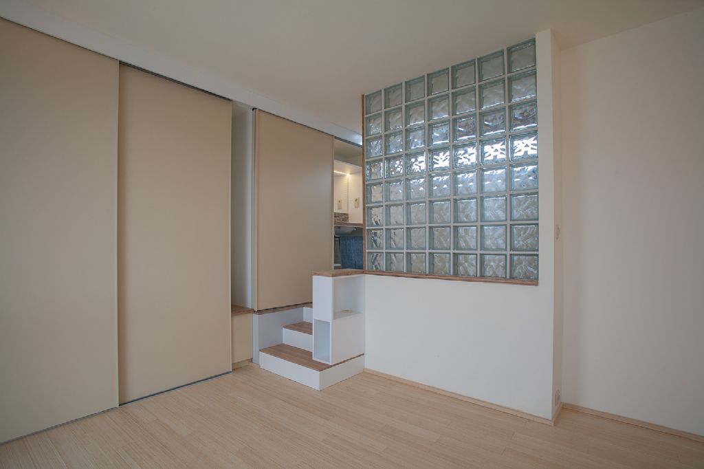 Situé dans un immeuble dont la largeur varie de 4 m à 5 m, l’appartement du 2e étage a été agrandi en récupérant le grenier pour y loger les chambres. Bien qu’il en soit le propriétaire et le futur occupant, l’objectif de l’architecte était de pouvoir y loger un couple avec 2 enfants. Cet appartement comprend donc trois chambres dont une à usage polyvalent, mais également une grande bibliothèque et un espace bureau. L’architecte a mis l’accent sur le développement de la volumétrie : « La hauteur sous-plafond du séjour varie de 2 m 45 à 2 m 70 dans la salle à manger pour atteindre 3 m 83 dans le bureau où la bibliothèque se déploie sur toute la hauteur. L’escalier qui jouxte la bibliothèque accentue cette verticalité. La hauteur de 2 m 70 de la salle à manger donne toute son importance à la porte-fenêtre existante qui permet l’accès à une petite terrasse. » Quant au séjour, il se prolonge dans sa longueur au-dessus d’une partie de la cage d’escalier des communs.