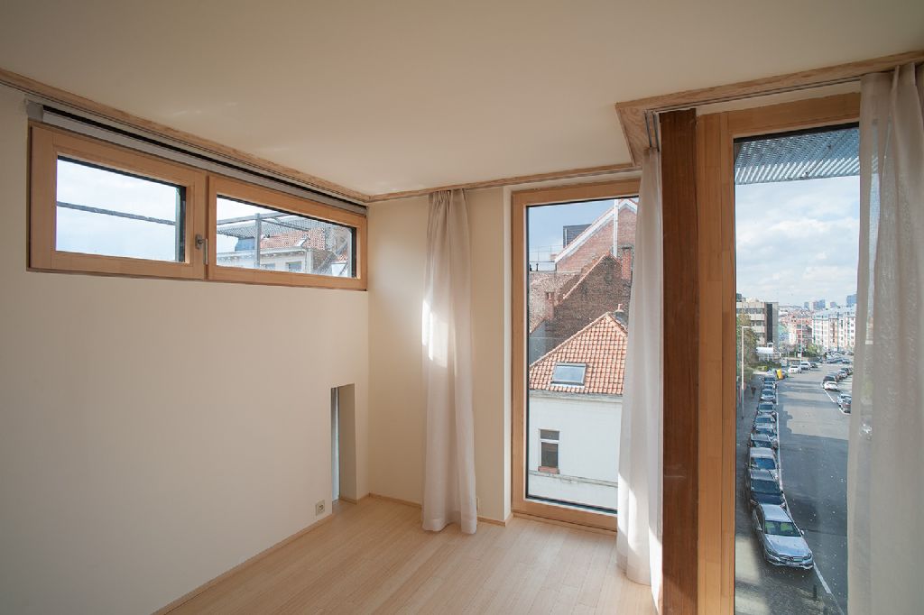 A la question des matériaux et des techniques mis en œuvre dans ce projet, l’architecte répond : « Selon l’urbanisme, le bas des murs en briques devait subsister sur une hauteur de +/- 30 cm. Ceux-ci ont été complétés par des blocs de chanvre de 6 cm qui permettent de réguler le taux d’humidité et d’éviter ainsi la condensation dans le mur existant. Les caissons en bois préfabriqués reposent sur la maçonnerie existante en briques. Ils sont remplis de 18 cm de cellulose complété par 4 cm de laine de bois. Les murs mitoyens sont composés de deux fois 14 cm de blocs de béton cellulaire avec 4 cm de laine de bois sur le côté intérieur. L’isolation thermique et acoustique est complétée, côté intérieur, par 6 cm de laine de bois.