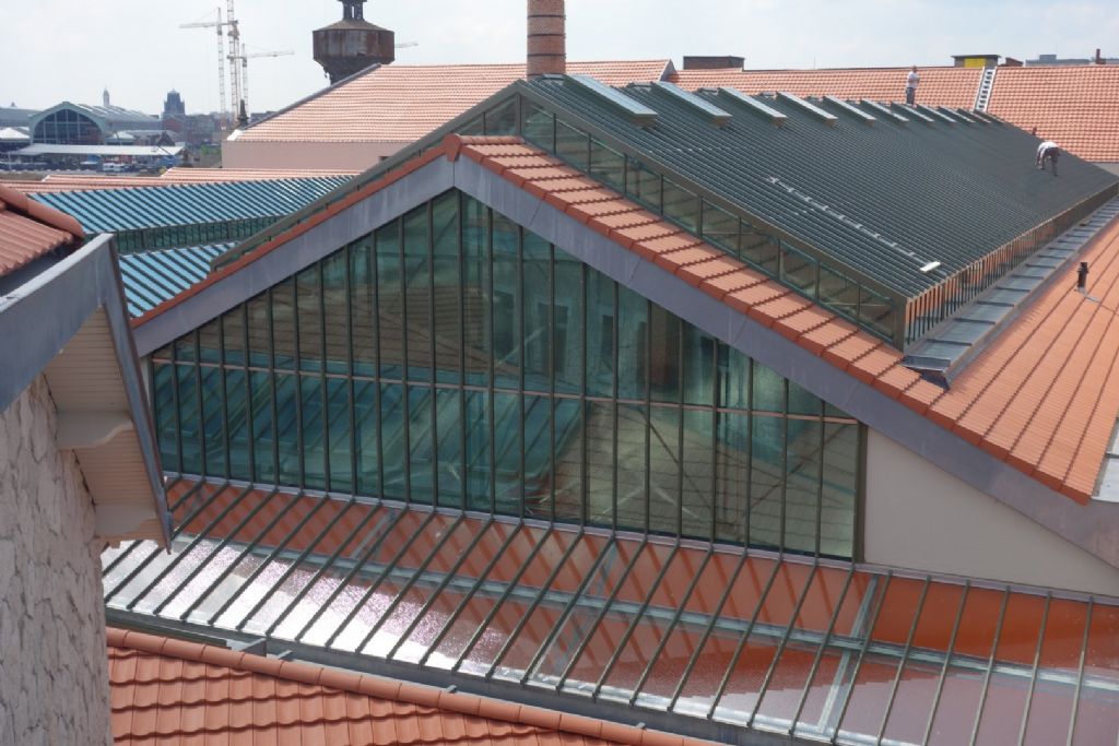 C’est la ferronnerie Dejeond qui, en sous-traitance de l’entrepreneur Galère, s’est chargée de refaire toutes les verrières, dans le respect à la fois du patrimoine et des normes actuelles. Anne Dejeond, gérante : « Les toitures étant classées, il y avait obligation de remplacer l’existant (de simples fers T et cornières) par de nouveaux profilés en acier, à l’aspect presqu’aussi mince que les anciens mais compatibles avec du double vitrage. Ce qui n’existe pas en standard... En concertation avec Galère, et grâce à la taille importante du chantier (chaque pan de la grande verrière fait 6,20 m, ou 2,5 m pour les petites verrières et ce sur une longueur d’environ 50 m), nous avons pu créer un profilé spécifique en acier, sur mesure pour ce bâtiment. »