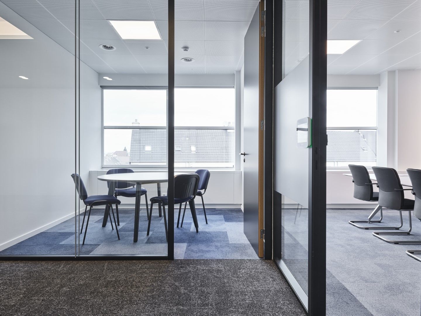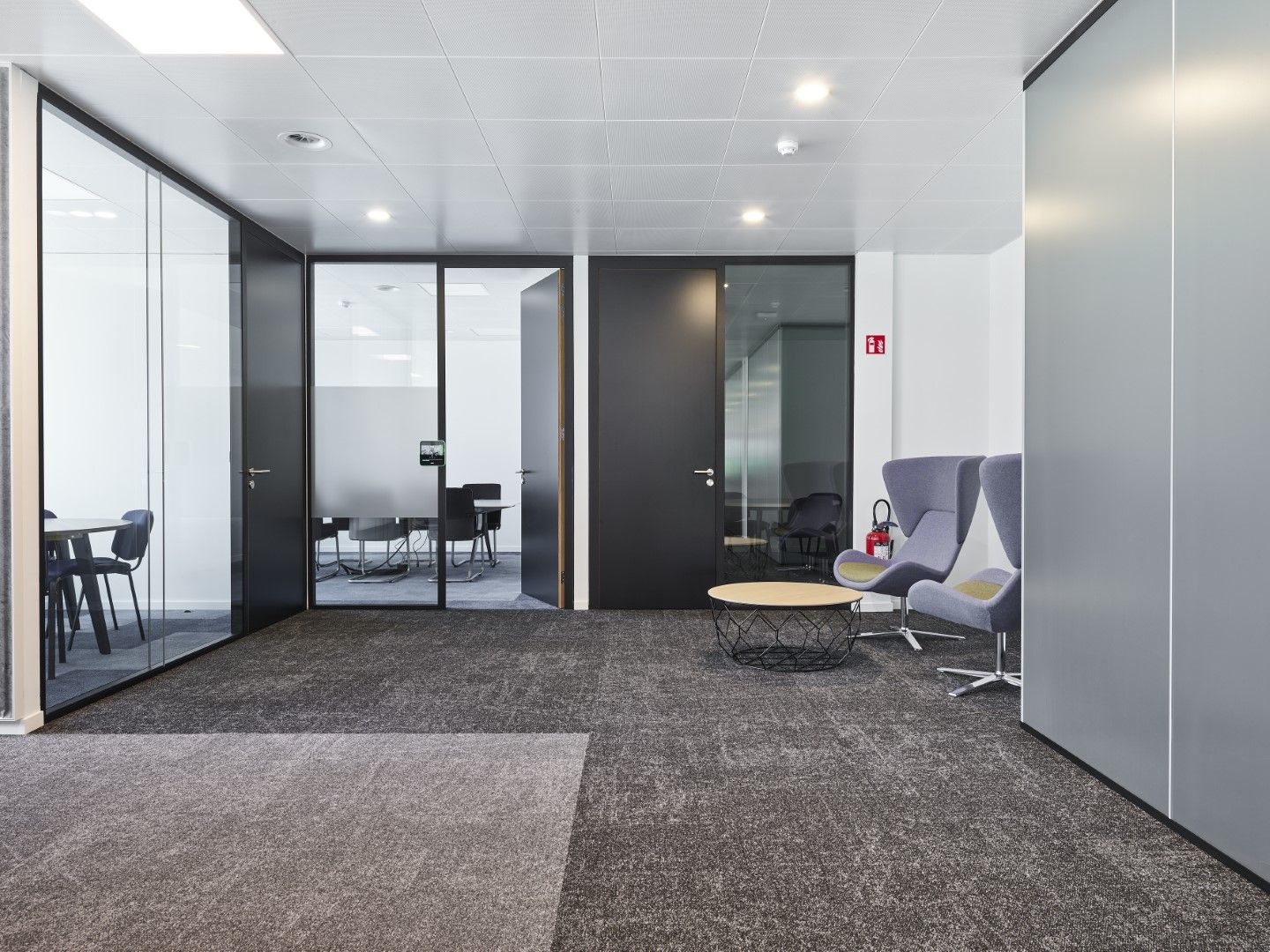Les produits Beddeleem utilisés sont des cloisons amovibles JB PURE 100, des ensembles de portes JB DOOR, des cache-convecteurs JB CONVEC, un comptoir d'accueil JB CUSTOM et des meubles sanitaires.