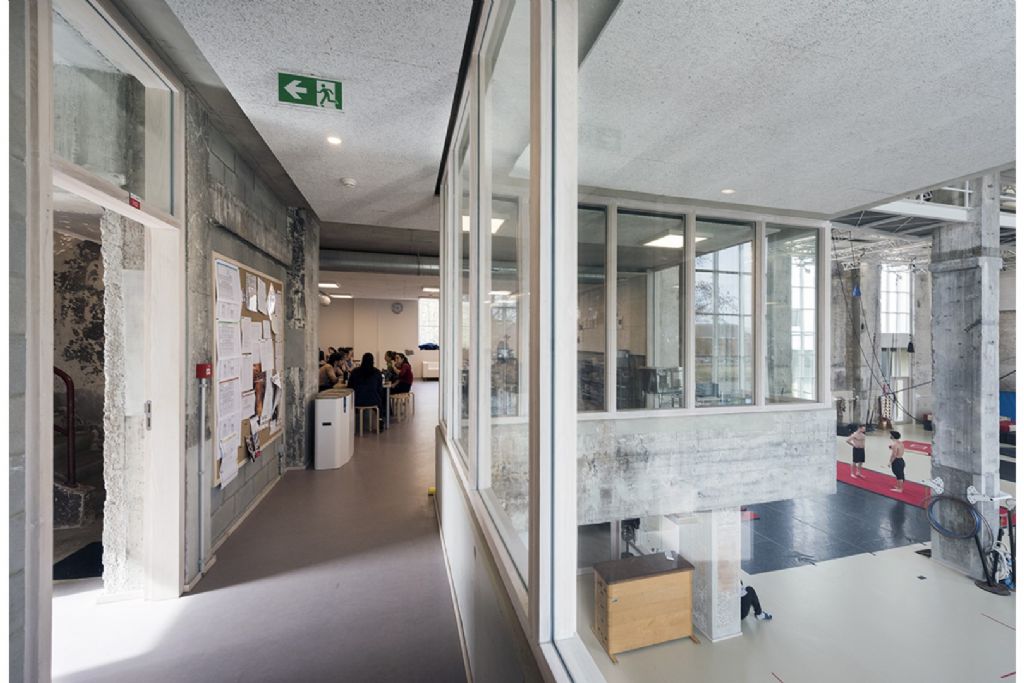 Depuis les années ’90, l’Atelier d’Architecture Daniel Delgoffe conçoit des projets de rénovation et de construction d’établissements scolaires. Pour l’Ecole Supérieure des Arts du Cirque (ESAC) à Anderlecht, les architectes ont combiné les deux à la demande du Service Public Francophone Bruxellois, responsable de l’enseignement et de la formation en Région de Bruxelles-Capitale.