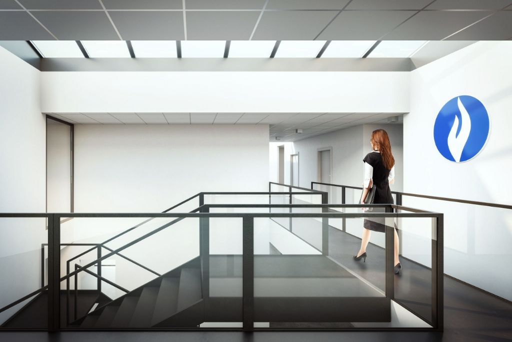 Le cœur du bâtiment s’ouvre sur 2 niveaux. C’est un espace ouvert ou les flux des services se croisent, à proximité directe de l’espace cafétéria, lui-même donnant sur une terrasse idéalement orientée et positionnée loin des zones visibles ou accessibles du public. Un escalier principal, distinct des circulations verticales de service ou de secours, accueille les utilisateurs comme une main tendue. Il gravit l’étage pour donner accès à la passerelle, à la croisée des services et de la zone réservée à la direction. Ce dernier espace, en débord et surplombant l’entrée du personnel, marque volontairement sa présence dans la volumétrie globale et offre un contrôle visuel permanent sur l’entrée des véhicules de service et du personnel.