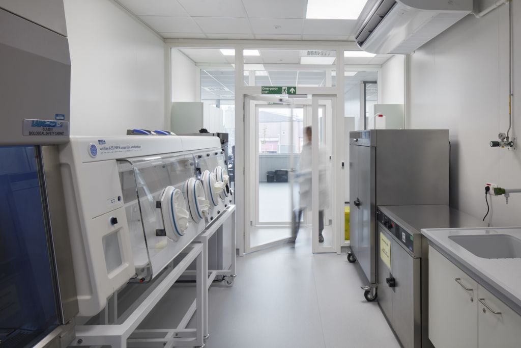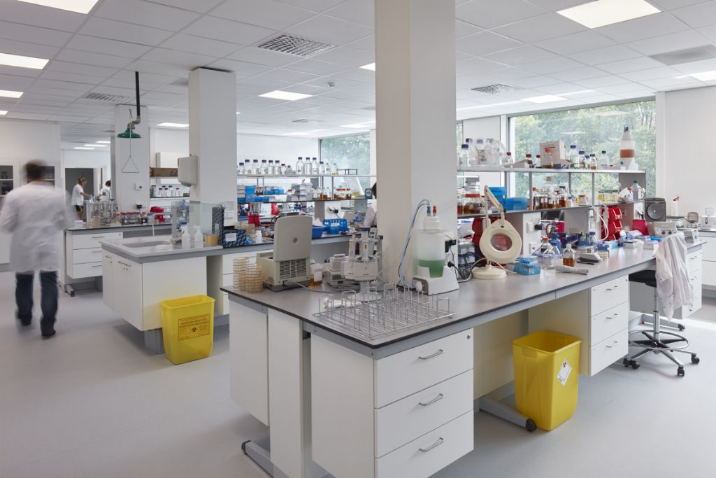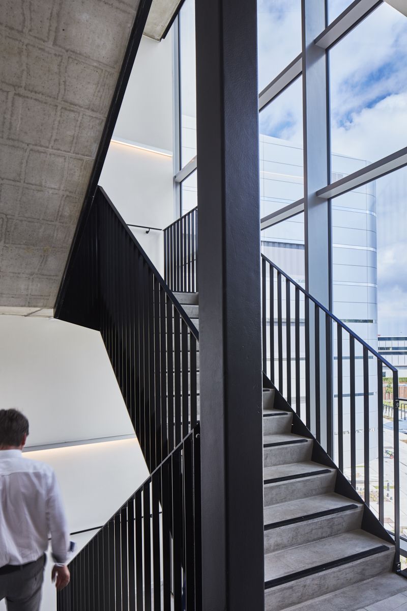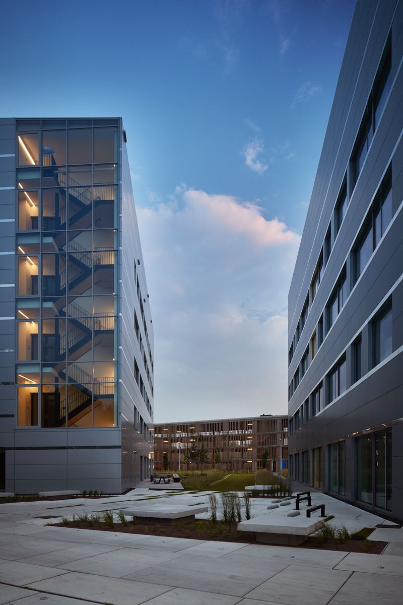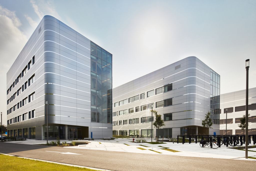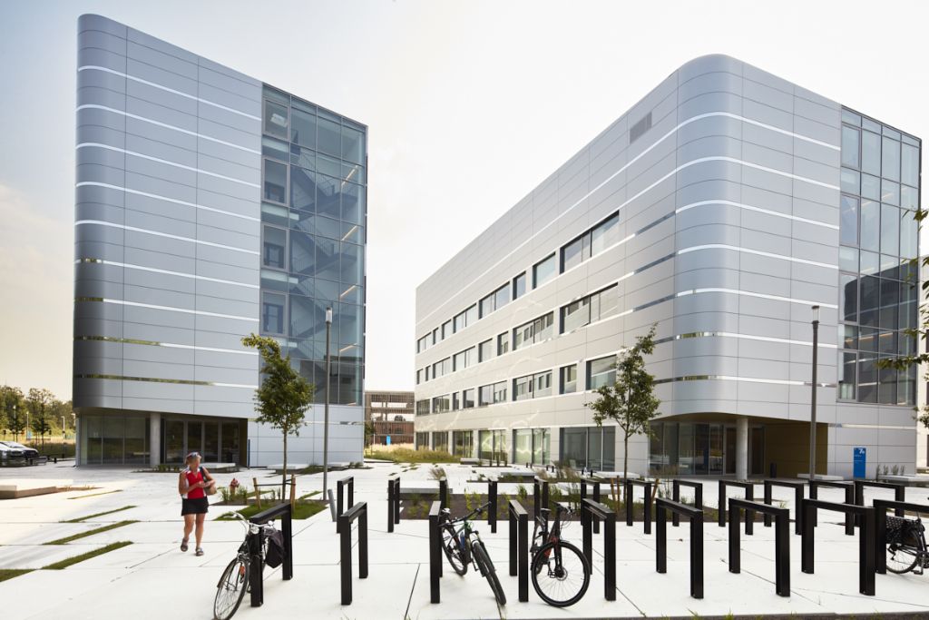 La disposition des laboratoires n'est pas figée et peut être adaptée aux besoins changeants des utilisateurs. Les laboratoires nécessitent également une ventilation importante, bien plus qu'un immeuble de bureaux ou résidentiel. Les appareils étant régulièrement déplacés, il fallait trouver un modèle efficace et adaptable à toutes les installations. Pour créer cette liberté, des dalles de plancher portantes vont d'un côté à l'autre des bâtiments. Cela représente chaque fois 500 m² d'espace libre sans colonnes ni poutres. De l’intérieur, les larges fenêtres jusqu’au plafond ne suggèrent pas une façade porteuse. Pourtant, la structure extérieure montre des variations subtiles dans la division des façades. Les coupures entre les fenêtres supérieures dissimulent de minces colonnes qui s'élargissent à chaque étage inférieur, pour en arriver, dans le plus haut des bâtiments, à des plateaux de 120 x 40 cm au rez-de-chaussée.