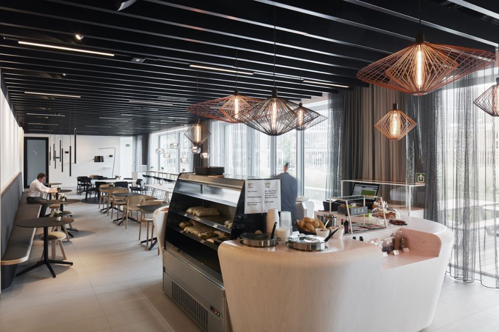 16 500 m² ont été construits sur un terrain qui était auparavant entièrement construit avec 10 000 m². Le rapport sol / terrain est passé de 4/5 à 4/3 grâce à des constructions en hauteur du côté autoroute. Le parking voisin a la forme d'un volume allongé entre deux pentes semi-circulaires et un toit vert de +/- 2000 m². À l'intérieur, la quantité de lumière surprend grâce aux façades en lattis de bois ouverts. L'espacement inégal dans le lattis fait référence à des combinaisons dans l'ADN, exprimées en code-barres. Un motif qui revient également dans le béton et les bandes d'herbe perméables à l'eau du revêtement central.