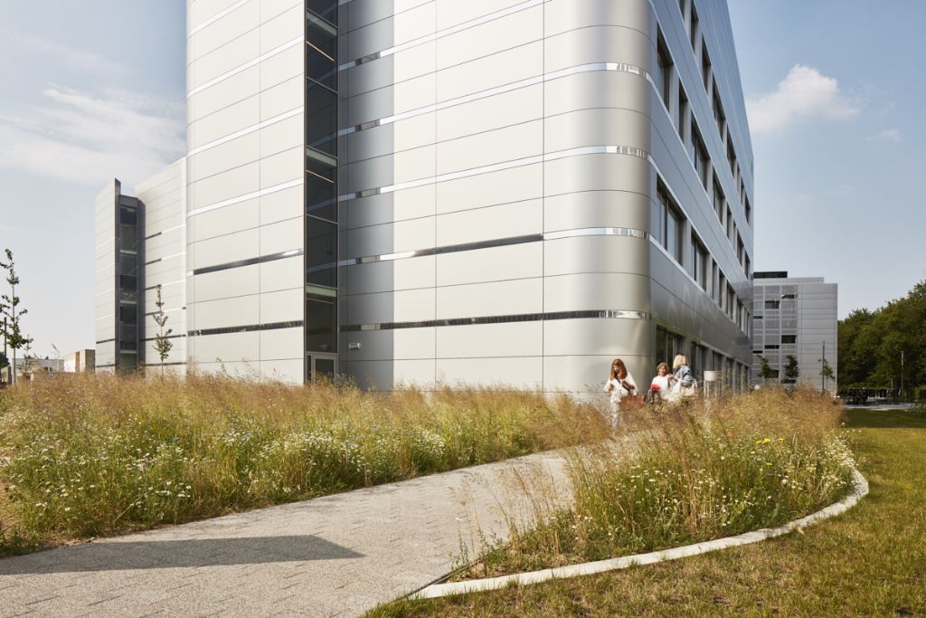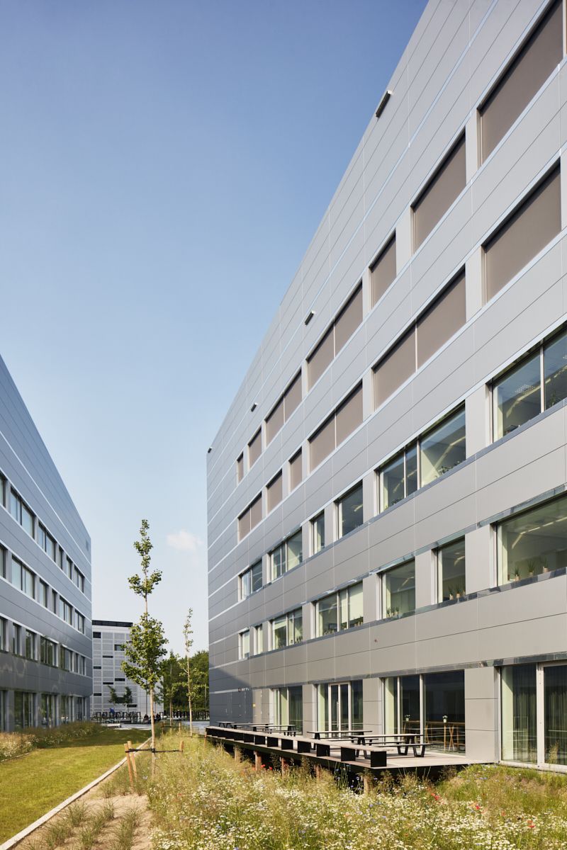 Pour attirer les chercheurs les plus talentueux, il fallait que l'environnement de travail soit inspirant. Cela démarre dès l'arrivée avec un chemin sillonnant entre les fleurs sauvages et les herbes hautes. A l'intérieur, il est frappant de constater à quel point la lumière naturelle est présente dans les espaces de travail, grâce à la profondeur limitée des bâtiments et aux fenêtres étonnamment grandes. Les yeux, après être restés concentrés toute la journée sur un écran ou un microscope, peuvent se reposer grâce à la vue panoramique depuis la cage d'escalier.