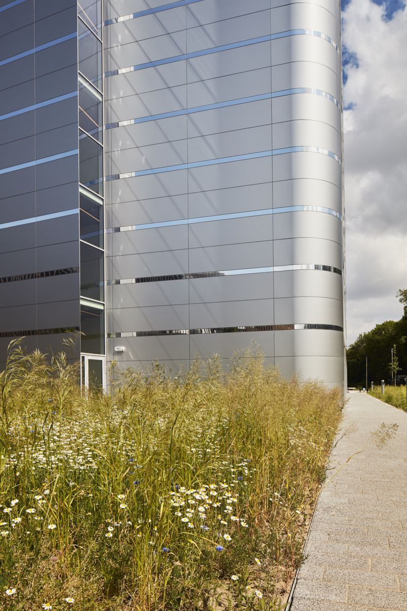 Les laboratoires doivent garantir des conditions stables et contrôlées pour les chercheurs. Ils doivent donc être hermétiques, un peu comme une bouteille thermos ou un frigo. C'est le rôle que joue ici une peau extérieure compacte en aluminium argenté. Les profilés de rives de toiture et les tablettes des fenêtres sont cachés. Les bords et les coutures sont millimétriques, quasi invisibles. Des panneaux arrondis ont été spécialement étendus au-delà des coins afin de souligner la continuité de l'enveloppe du bâtiment.