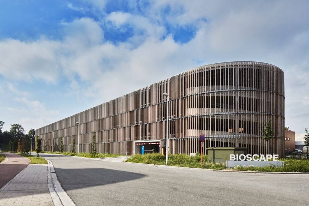 BIOSCAPE a été construit sur le site originel d'Innogenetics, pionnier flamand en biotechnologie. Le projet consistait à construire trois nouveaux bâtiments et à les réunir à un quatrième, existant et à rénover entièrement. Les surfaces en pente et les angles arrondis relient les volumes construits et non construits. On note aussi une alternance de volumes métalliques compacts et d'espaces verts, sur ce terrain situé entre autoroutes et industries.