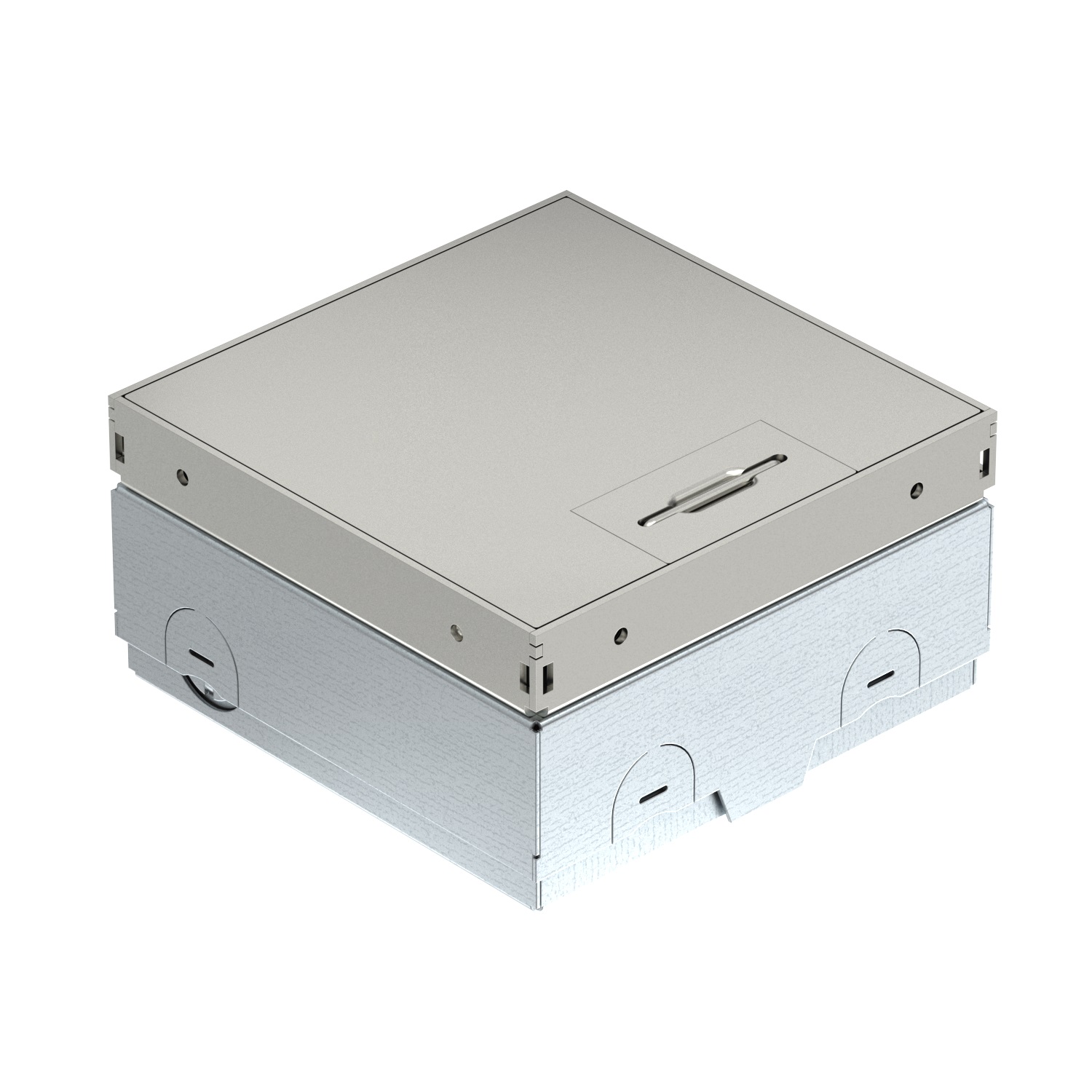 Le boitier de sol UDHOME-ONE est très compact et son intégration dans le sol nécessite très peu d’espace. Il peut être monté directement sur le sol non fini, raccordé par des câbles d’installation flexibles et ensuite achevé en même temps que la chape. Ses petites dimensions extérieures de 140 x 140 mm et sa petite hauteur d’encastrement à partir de 75 mm font qu’il est extrêmement plat et adapté aux chapes fines. Grâce à son mécanisme de nivèlement intégré, UDHOME-ONE peut aussi être installé dans des sols qui font jusqu’à 100 mm.