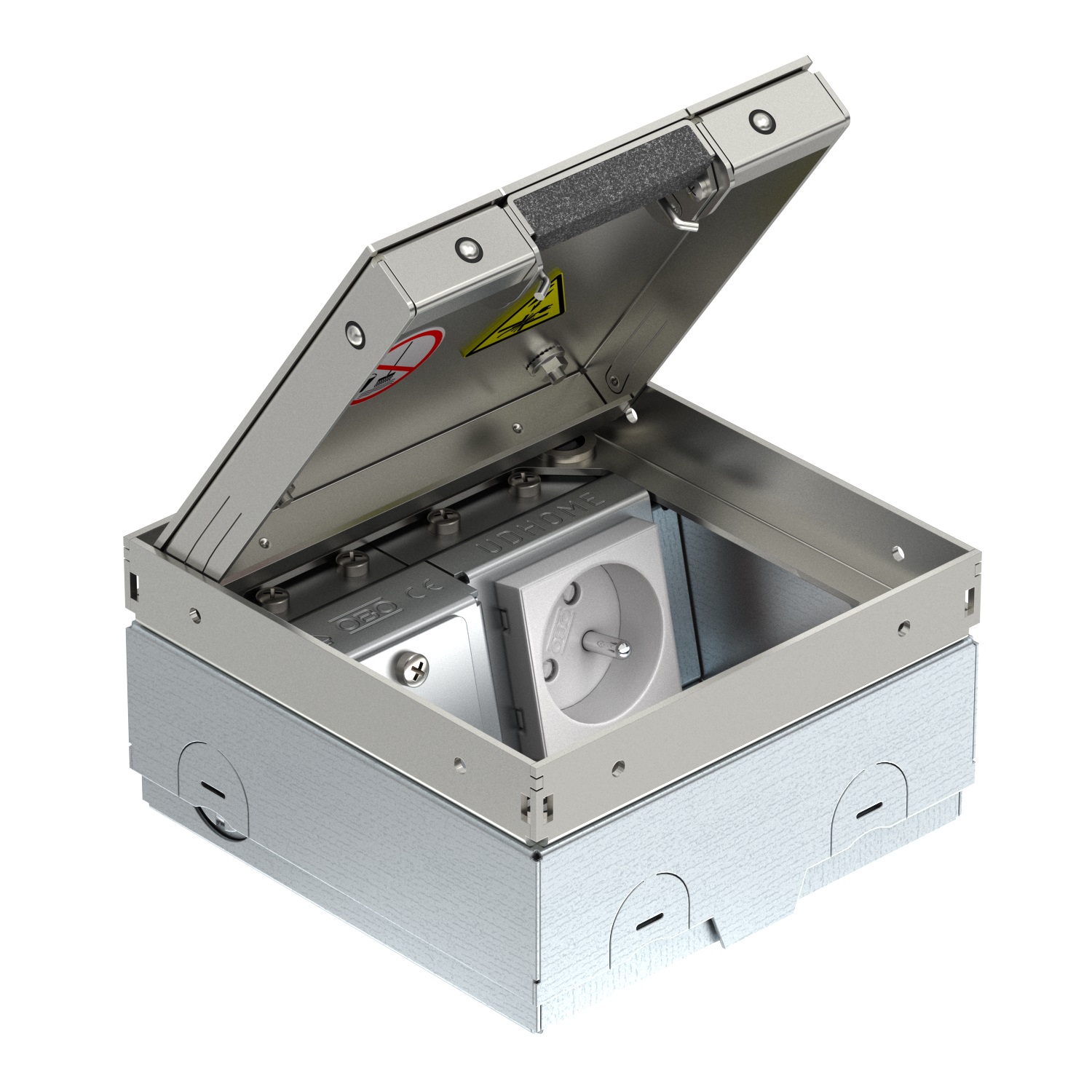 Comme tous les boitiers de sol OBO, UDHOME-ONE combine fonctionnalité maximale et esthétique raffinée. Le petit boitier de sol est équipé de deux variantes de couvercle faciles à changer à tout moment. Le couvercle est disponible avec évidement ou avec plaque décorative. Quelle que soit la variante utilisée, la hauteur du boitier de sol ne doit pas être réajustée ni mise à niveau. Les câbles passent par une sortie de cordon intégrée dans le couvercle. En plus, tous les côtés intérieurs ont été travaillés et lissés machinalement, ce qui réduit considérablement le risque de lésions et d’endommagement des câbles. C’est ainsi que UDHOME-ONE établit de nouvelles normes en matière de confort d’utilisation.