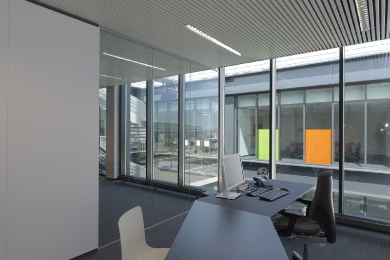 La fonctionnalité est au cœur de l’art de concevoir un bâtiment. Dans le cas du siège wallon de Brutélé, chaque service est complémentaire des autres, indissociable. Ensemble, ils forment un tout cohérent où les technologies jouent un rôle essentiel. Dans ce sens, la technique du bâtiment traduit cette philosophie au travers d’une épine dorsale qui innerve, sur toute la longueur du bâtiment, chaque service de la logistique appropriée. Il paraissait essentiel aux architectes concepteurs que l’ensemble des services soient regroupés sur 2 niveaux, pour garantir un maximum de proximité et de synergie. La façade largement vitrée au nord est non seulement une manière d’inonder de lumière naturelle constante l’ensemble des services, pour le plus grand confort des occupants, mais c’est aussi une lecture transparente de l’activité interne à l’entreprise.