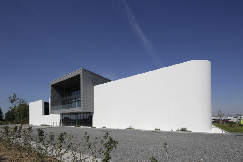 A la surenchère de langages architecturaux présents sur le site de l’Aéropôle de Gosselies, Art & Build Architect a préféré un langage extrêmement épuré, sobre, qui témoigne d’une grande sérénité. Le socle blanc se fait à la fois protecteur de l’activité à l’intérieur du bâtiment – protection contre les apports solaires, contre les nuisances sonores, contre l’intrusion –, mais aussi écran blanc, support potentiel de toutes les communications, qui sont au coeur même du métier de BRUTÉLÉ. L’élément qui surplombe le socle cristallise l’identité de l’entreprise au travers d’un parallélépipède de métal et de verre, évoquant l’industrie aéronautique. Il est aussi l’expression des fonctions collectives de l’entreprise telle que la salle du conseil, le restaurant d’entreprise, mais aussi la direction.