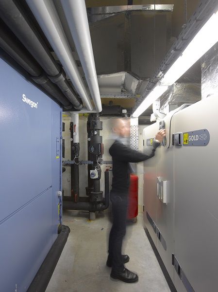 Outre l’excellente amélioration de l’enveloppe thermique, le projet a prévu la mise en place de techniques efficaces telles qu’une chaudière gaz à condensation couplée à une PAC Air-Eau réversible, une ventilation double flux et des plafonds rayonnants chaud-froid.