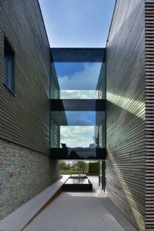 Pour relier physiquement les 2 bâtiments tout en scindant les 2 phases de construction, les architectes imaginent un espace passerelle vitré sur 2 niveaux. Ces zones de transitions permettent également de conserver une perspective traversante au cœur du projet. Tout comme les 2 passerelles, les pièces de bureaux sont agencées pour offrir un maximum de lumière naturelle. Cette démarche est encore plus évidente pour les 2 salles de réunions, littéralement projetées par des extensions vers l’extérieur du bâtiment.