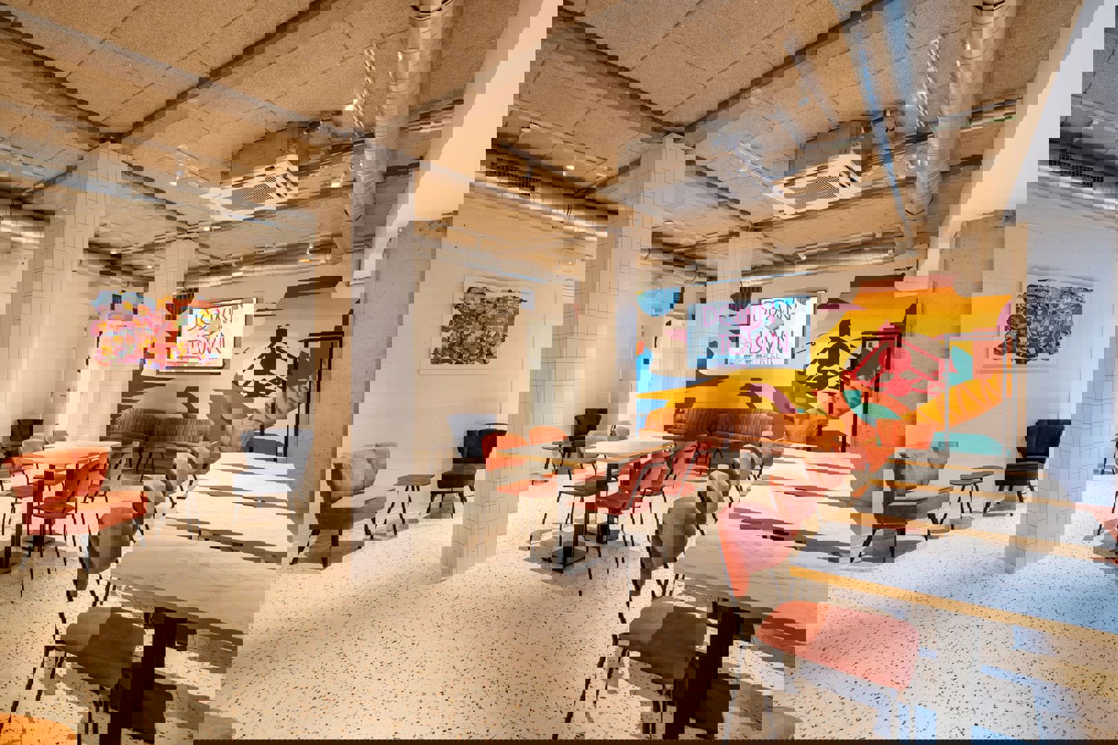 L’intérieur de BX. Downtown Hostel respire le caractère. Des teintes chaleureuses sont combinées à des accents colorés audacieux, créant une ambiance à la fois ludique et maîtrisée. Le bar et le comptoir d’accueil constituent de véritables points d’attraction et donnent immédiatement le ton à l’arrivée.