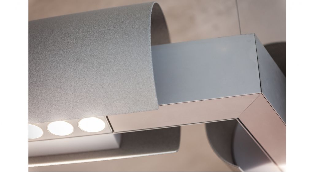 L’agence d’architecture Robbrecht & Daem a conçu une série d’éléments d’éclairage décoratifs qui servent les deux objectifs. Elle a fait appel au matériau CALME de Sonogamma, un absorbant microporeux unique constitué de fins granulés aluminium d’une haute pureté agglomérés qui offre une absorption acoustique large-bande sans matériau de remplissage : Une lame d’air lui suffit. Calme est en outre incombustible, non corrosif et 100% recyclable, ce qui correspond parfaitement à la philosophie durable du groupe. Les panneaux CALME cintrés au look gris argenté font office d’ abat-jours acoustiques pour les luminaires LED qui se fondent subtilement dans les plafonds des bureaux paysagers, des salles de réunion et de l’accueil. Suivant la configuration de la salle, leur suspension est pentagonale ou alignée. Ainsi, les armatures d’éclairage allient confort acoustique et fonctionnalité et s’accordent parfaitement avec l’architecture épurée du bâtiment. Les luminaires acoustiques CALME contribuent au bien-être des salariés sur le plan visuel et sonore et permettent ainsi des gains de productivité pour l’entreprise. La combinaison unique d’un plafond rayonnant hydraulique basse température et d’un matériau aux performances acoustiques pérennes, recyclable et sans fibre fait de ces armatures d’éclairage au design unique un atout indispensable sur tout lieu de travail.