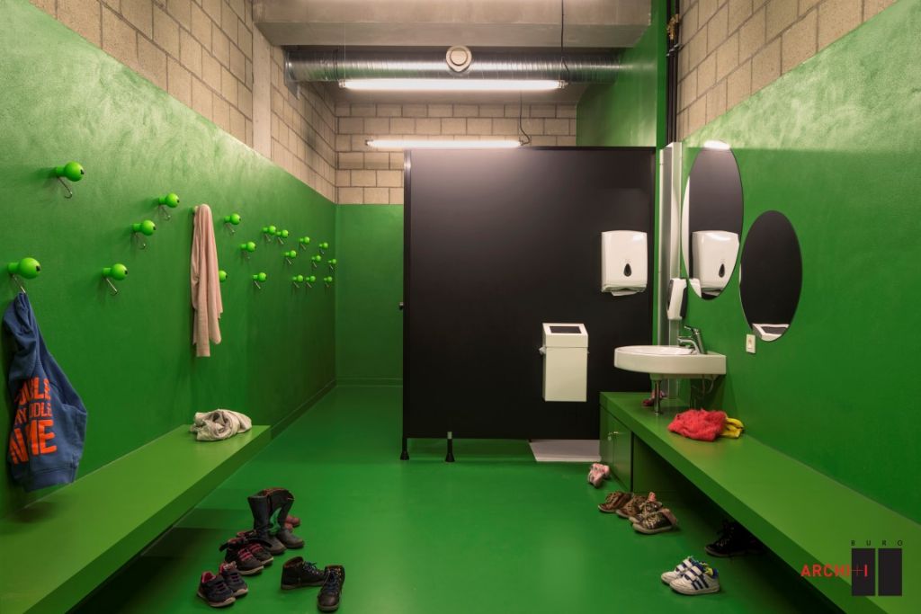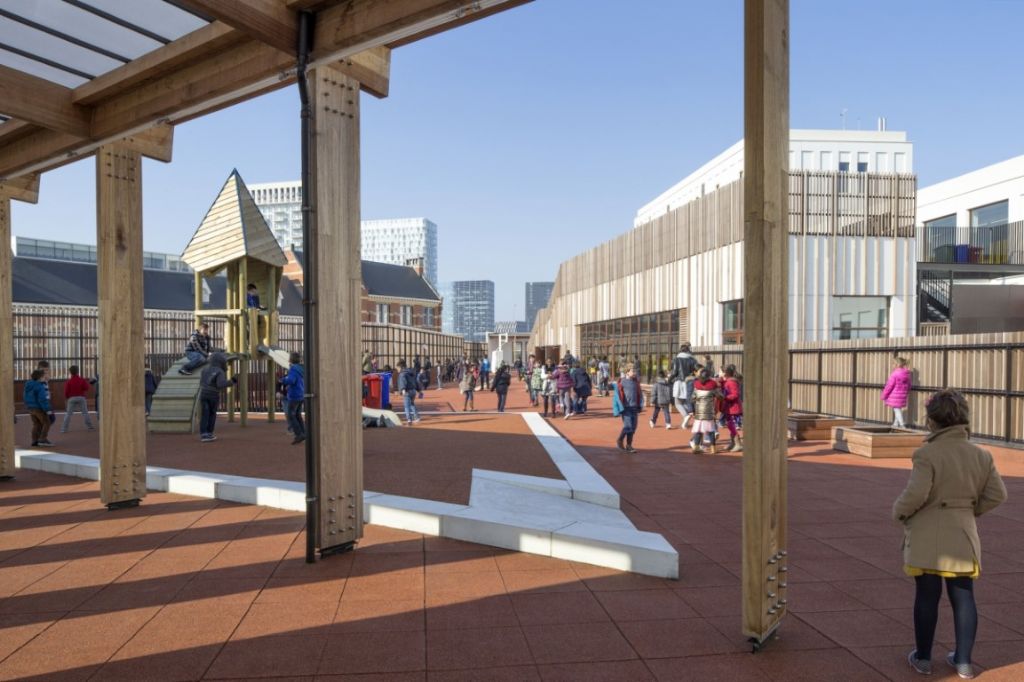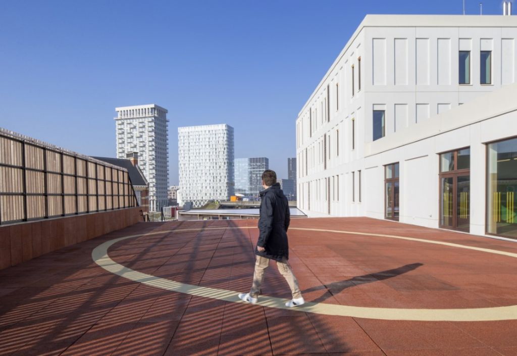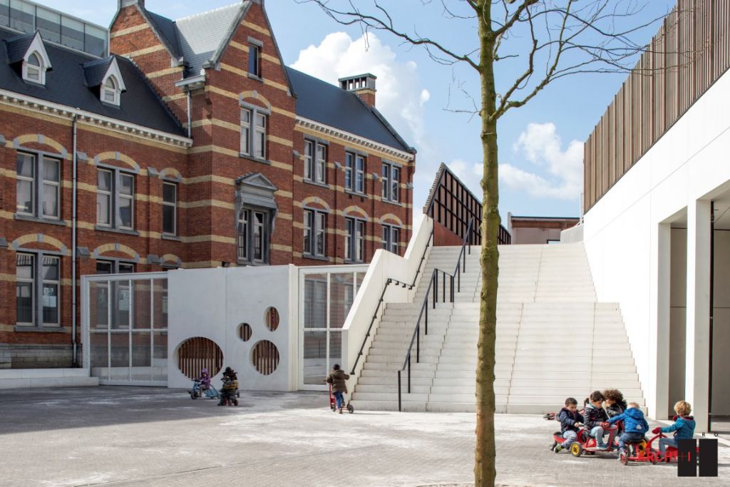 Les différentes sections sont bien déterminées dans le bâtiment, ainsi que la cascade d’espaces intérieurs qui en font partie. L’école maternelle est dirigée vers l’espace intérieur, qui offre plus de protection, tandis que les sections pour les plus grands regardent plus vers le parc et le côté rue. Au rez-de-chaussée, on trouve un espace de jeu clos pour les bambins. Les autres élèves n’y entrent en principe pas. En empruntant un grand escalier, vous vous retrouvez dans un autre espace de jeu commun, situé au niveau du réfectoire et de l’entrée de l’école primaire. Au fur et à mesure que l’enfant grandit et gravit les étapes, l’approche est de plus en plus ouverte. Dès que commence l’école secondaire, l’enfant va pouvoir profiter d’une vue panoramique sur la ville et ses environs. En raison de la surface limitée du terrain par rapport à la population scolaire (680 élèves), la plus grande partie des toits est utilisée comme cour de récréation.