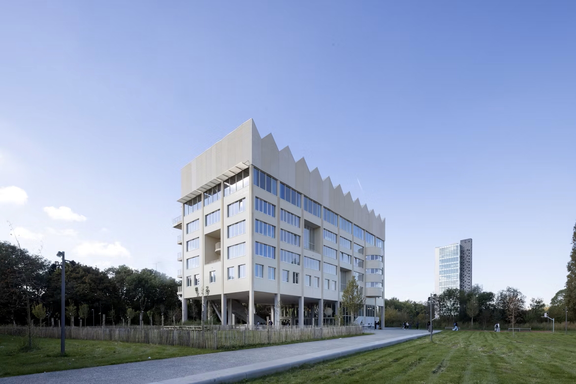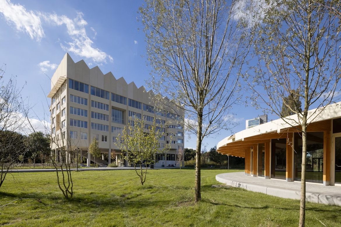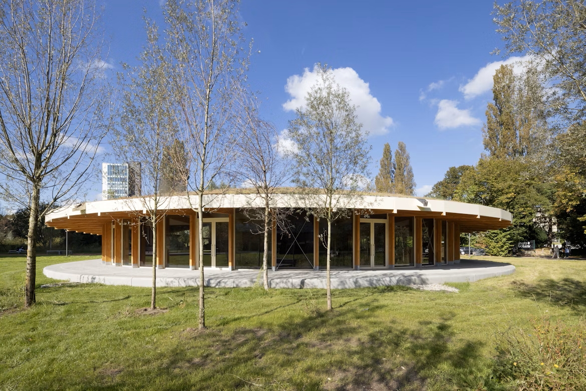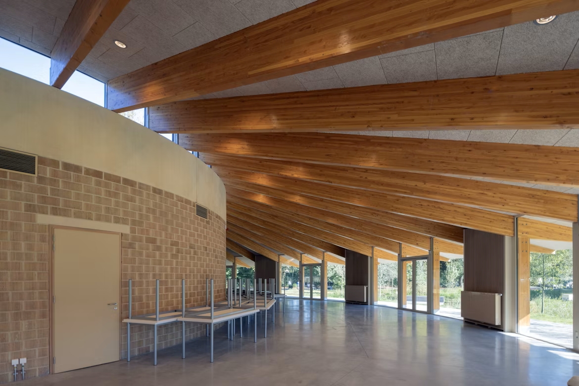 Le premier bâtiment que découvrent les visiteurs est le réfectoire, conçu par 51N4E. Ce volume bas et circulaire en bois est surmonté d’un vaste toit végétalisé. Sa large corniche crée un auvent sous lequel les élèves peuvent s’abriter pendant les pauses ou par temps de pluie. De grandes baies vitrées assurent transparence et dialogue visuel avec le parc.