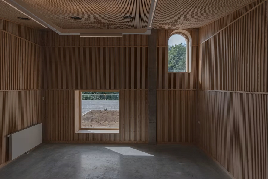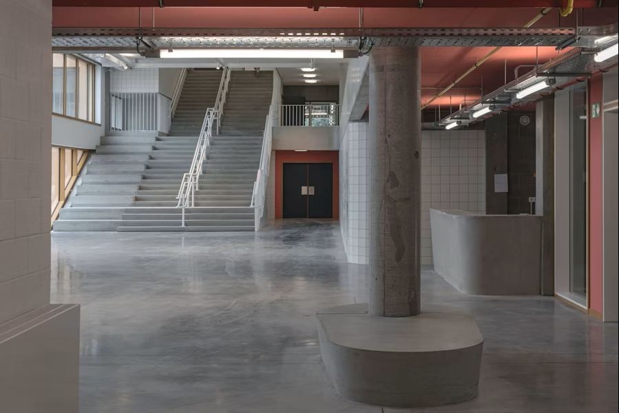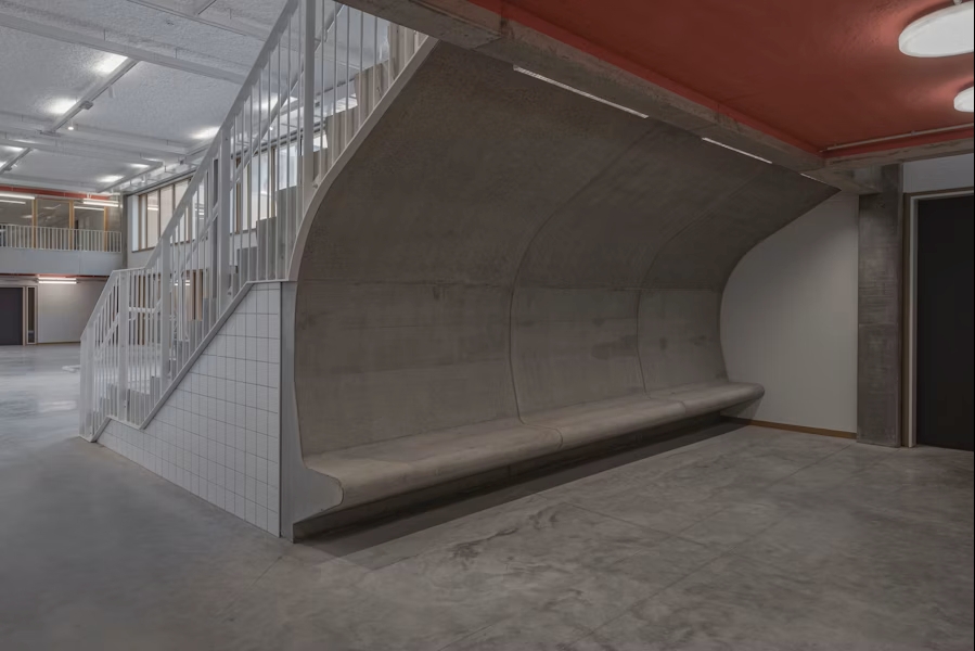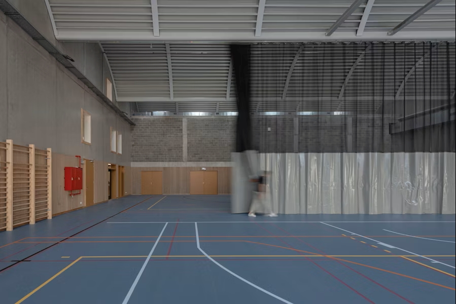 Côté canal, les serres dédiées à l’enseignement horticole rappellent l’histoire du campus alimentaire. Un toit ondulant monumental couvre la salle de sport, tandis que des détails surprenants – bancs intégrés en béton, escaliers menant à une terrasse sur l’eau – insufflent une dimension ludique à l’ensemble. L’architecture exprime une grande générosité : un lieu où les élèves disposent d’espace pour grandir, au sens propre comme au figuré.