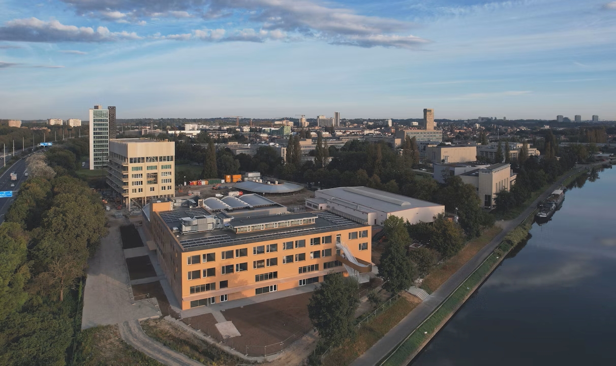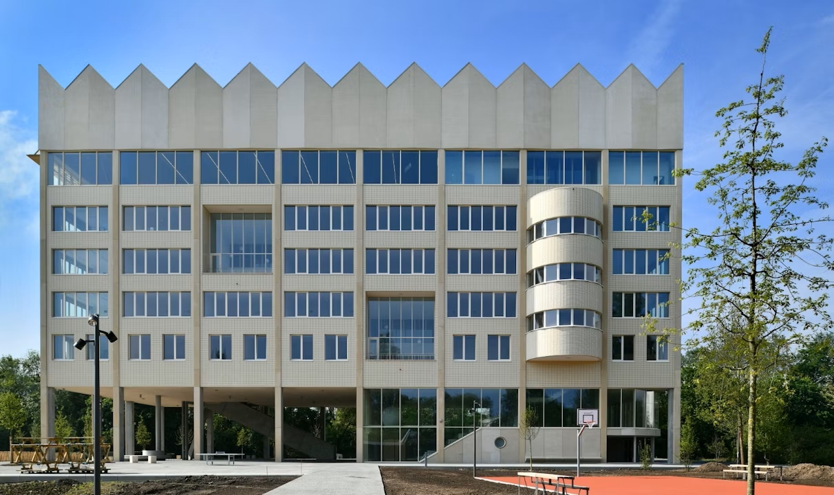 Quiconque emprunte le Ring de Bruxelles après Anderlecht l’aperçoit déjà de loin : une façade dorée surmontée d’un toit en dents de scie émerge au-dessus des arbres. Cette silhouette marque la Scholencampus Ceria, un ambitieux complexe scolaire signé par les bureaux d’architectes V+ architecture, MSA et 51N4E, conçu en collaboration avec Bureau Bouwtechniek, Greisch, MK Engineering, Plant en Houtgoed et Daidalos Peutz. Le maître d’ouvrage, la Commission communautaire française, mise ici sur un enseignement innovant et inclusif, dans un cadre paysager d’exception.