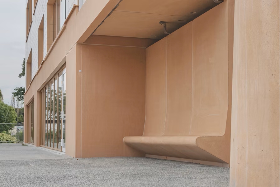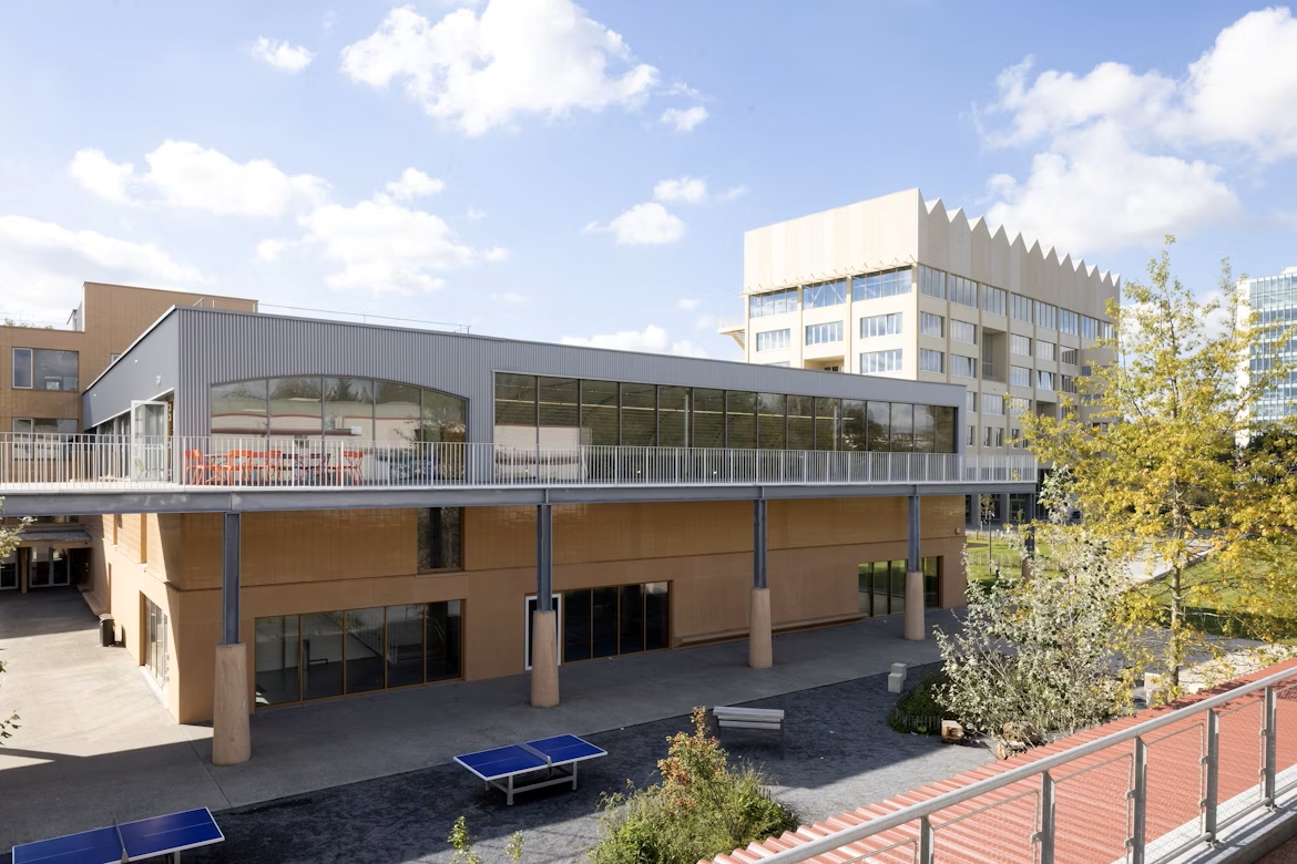 L’école du premier degré, conçue par V+, s’inscrit horizontalement dans le paysage. Son volume en U entoure une cour protégée, ouverte sur le parc. La toiture forme à la fois un auvent et une terrasse accessible, propice aux échanges. Les façades, en béton apparent finement détaillé, allient robustesse et convivialité.