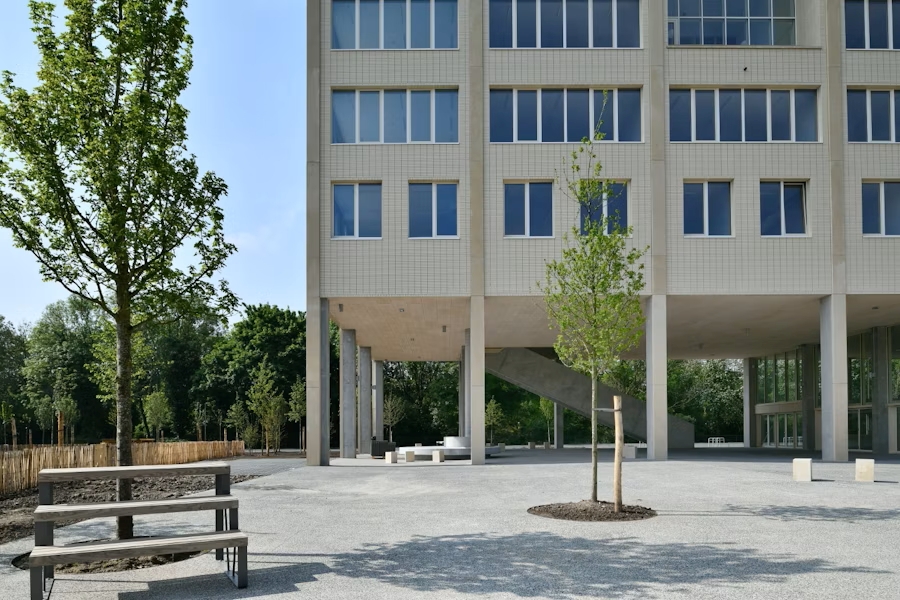 Le plan paysager de Plant en Houtgoed relie les différents bâtiments en un ensemble cohérent. Pelouses ouvertes, petits jardins, massifs d’arbres et zones sportives se succèdent naturellement. Une clôture discrète entoure le site sans compromettre son ouverture. Les rez-de-chaussée, largement vitrés, dialoguent avec le parc, qui devient ainsi une vaste cour de récréation.
