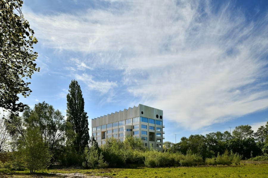 Le concept repose sur une idée simple mais forte : concevoir le campus comme une série de pavillons autonomes implantés dans un grand parc. Plutôt que de construire un volume continu, V+, MSA et 51N4E ont choisi de donner à chaque programme sa propre identité architecturale. Les bâtiments se répartissent entre pelouses, terrains de sport et jardins fleuris, reliés par un réseau de sentiers. Il en résulte un ensemble ouvert et accessible, qui renforce les liens avec le quartier voisin, le canal et le Ring.