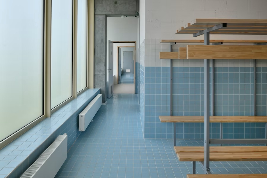 Plus loin, le même bureau a réhabilité l’ancienne salle de sport – la « Hall O » – transformée en une structure ouverte et baignée de lumière, dotée de fenêtres sur ses deux pignons. Bibliothèque et vestiaires ont été repensés, tandis que la façade donnant sur la drève a retrouvé une nouvelle vie. En privilégiant la rénovation plutôt que la démolition, les concepteurs ont non seulement libéré du budget pour d’autres bâtiments, mais aussi préservé la mémoire du site.
