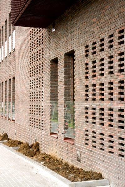 Les architectes ont poussé la démarche encore plus loin en créant un fil conducteur supplémentaire entre les cinq bâtiments, par le dessin d’appareillages qui animent la composition des façades : briques posées en relief ou en retrait de la maçonnerie, claustra, ... Ces jeux d’appareillages restent discrets et subtils et contrebalancent le choix d’une brique au caractère bien marqué : une brique nuancée de teinte rouge/brun, assez irrégulière.