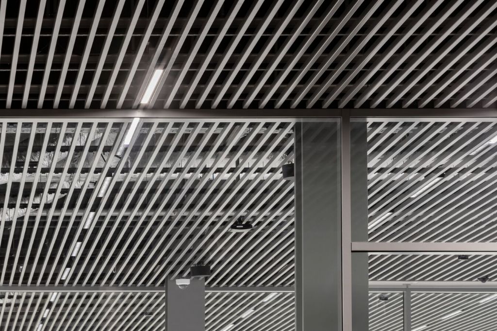 Une approche de conception personnalisée a été choisie pour le plafond intérieur. Soors: Deux fois moins de lattes ont été utilisées, ce qui signifie que le plafond est ouvert. Cela était nécessaire pour l’installation de traitement d’air dans le plénum, pour laquelle une ouverture minimale de 70 % du plafond était requise. Nous pourrions facilement y parvenir avec ce produit en retirant une latte à la fois.’’