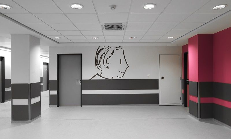 Chaque fonction de l’hôpital est installée dans un volume clairement identifiable tant à l’extérieur qu’à l’intérieur du bâtiment. Les circuits empruntés par les patients hospitalisés, les patients ambulatoires et les visiteurs sont strictement séparés. La déclivité du site permet, d’une part, des accès et des prises de lumière via les façades sud et ouest des niveaux du socle situés sous le rez-de-chaussée, et d’autre part des accès de plain-pied dans le grand hall via les façades nord et est. Le découpage du bâtiment et le grand développé de façade qui en découle permet d’apporter de l’éclairage naturel dans les espaces de travail et de circulation, pour le bien-être des patients, des visiteurs comme du personnel. La signalétique mise en place est notamment caractérisée par un accompagnement graphique dans les déplacements au sein de l’hôpital. Il donne un maximum d’autonomie aux visiteurs et aux patients, en leur évitant le recours systématique à un service d’information pour les guider. La couleur est aussi utilisée comme outil de repère dans l’espace : les différents volumes de l’hôpital sont identifiés par 7 couleurs vives appliquées ponctuellement aux endroits clés du parcours des patients et des visiteurs.