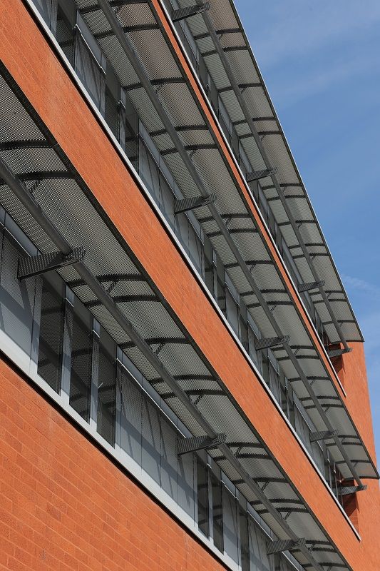 Les ailes d’hospitalisation s’organisent en peigne de part et d’autre d’un axe longitudinal de circulation. Leurs façades sont traitées en bandeaux horizontaux alternant des lignes de maçonnerie rouge et des lignes de châssis à modules vitrés ou pleins, rehaussées de pare-soleil cintrés en tôle perforée. Sur l’axe central de circulation, les façades intercalées entre les ailes de soins sont totalement vitrées sur toute leur hauteur. Les façades du volume contenant les consultations sont entièrement revêtues d’un bardage ajouré de lamelles métalliques à orientation variable. Le socle est traité en maçonnerie de brique de terre cuite faïencée de couleur anthracite. Les ouvertures sont ordonnancées de manière aléatoire.