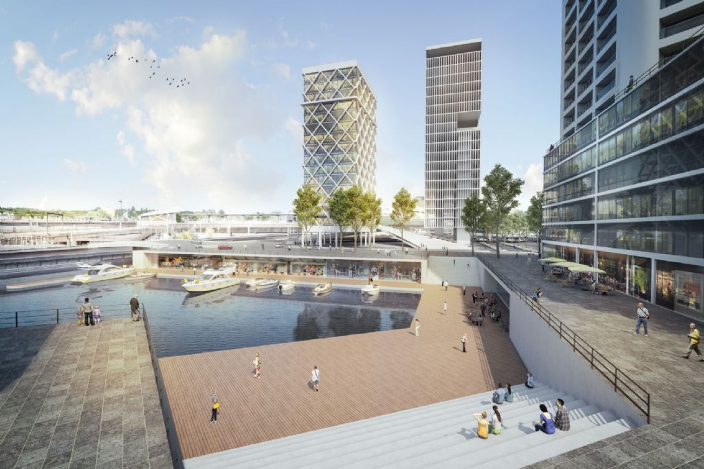 Accueillant une marina d’une capacité de 22 bateaux, le nouveau quartier d'affaires se déploiera sur près de 35.500 m² de bureaux et près de 33.500 m² de logements et d’hébergements, sous la forme de tours, parsemés d’espaces verts et de parkings. Depuis la halte nautique, future « place Bleue », l’axe de la rue de Marchienne permettra de connecter directement ce quartier d’affaires au pôle commercial de la place Verte.
