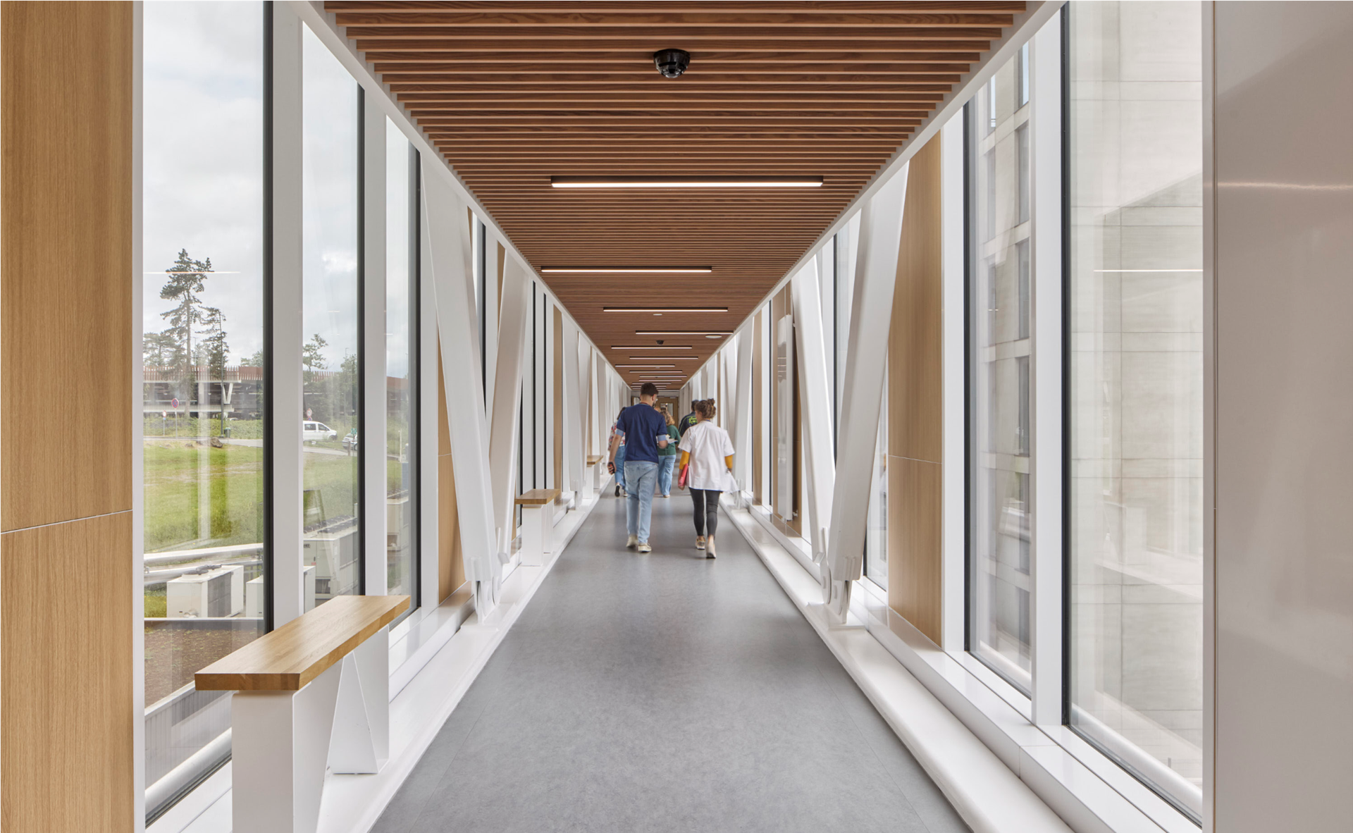 La mobilité douce est privilégiée grâce à la nouvelle zone piétonne. La zone boisée qui entoure le bâtiment peut être visitée librement par les patients en quête de calme et de nature.