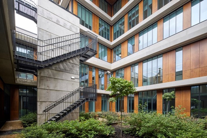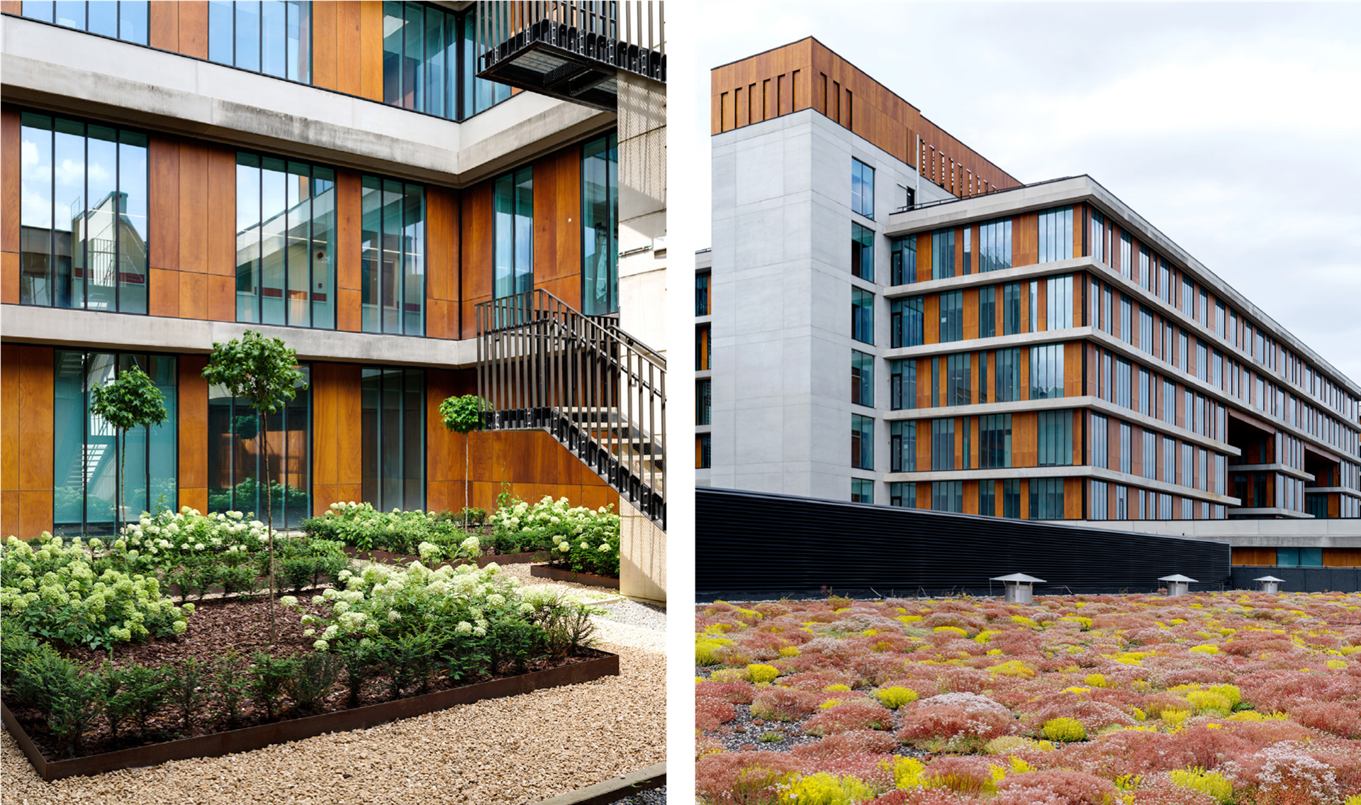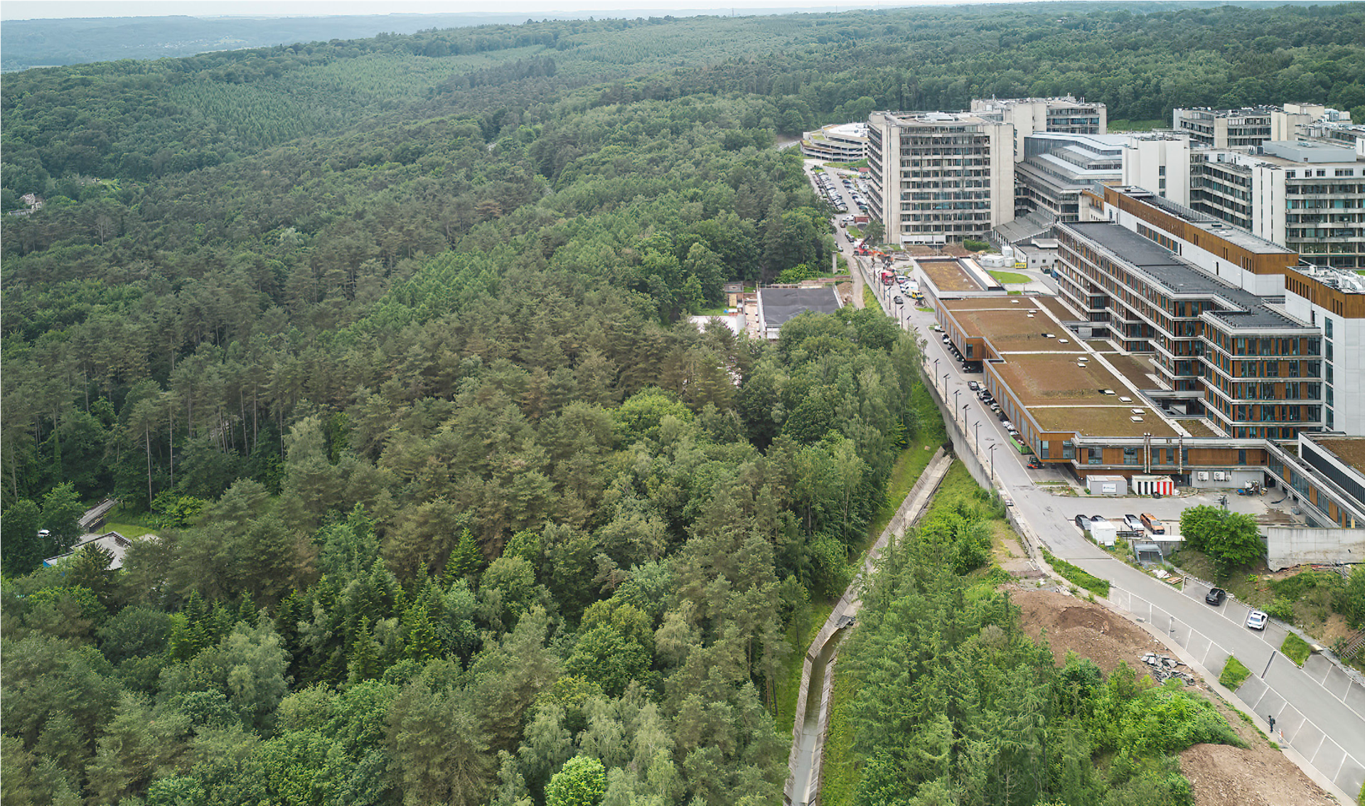 Le site du Sart Tilman est situé dans un paysage particulier. Dans le respect de ce paysage naturel, nous avons travaillé à une implantation soignée du bâtiment. Les espaces verts et les plantations du bâtiment sont en harmonie avec les collines verdoyantes des environs. De plus, les plantations se reflètent sur les toits verts visibles depuis les différents coins du bâtiment.