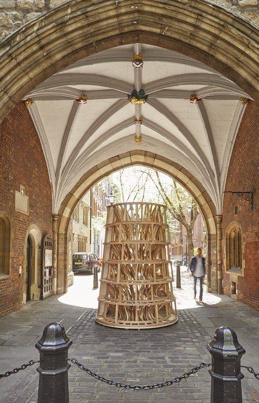 Cette scénographie de plus de de trois mètres de haut célèbre le travail du bois et de l'artisanat. En l’espace de trois mois deux des plus brillants jeunes talents du Royaume-Uni, Sebastian Cox et l’artiste Laura Ellen Bacon ont élaboré cette structure en bois feuillus américains, qui a été exposée fin mai pendant la Clerkenwell Design Week (CDW) sous l’arche d’entrée de l’ancien prieuré de l'ordre de Saint-Jean de Jérusalem, à Londres.