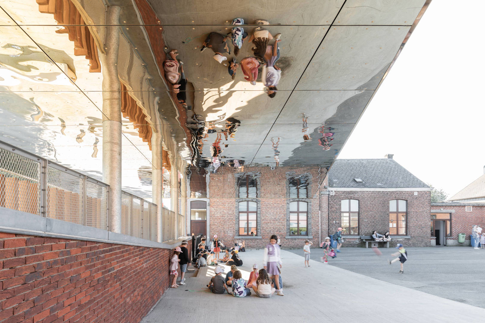 Le préau se distingue par son esthétique : une structure en acier galvanisé gris clair, suspendue à des poteaux, dont la sous-face en acier inoxydable doré agit comme un miroir. Ce jeu de reflets capte les mouvements et activités, apportant une touche à la fois ludique et poétique.