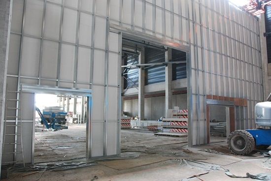 L’immense superficie du nouveau bâtiment, c.à.d. 8000 m², nécessite un compartimentage coupe-feu. L’architecte a décidé de réaliser ce compartimentage moyennant le système Promat SYSTEMWALL, car il s’agit d’un système très léger, qui se laisse installer rapidement et intégrer parfaitement dans l’ensemble. Cette cloison grande hauteur de plus que 9 m de haut a été construite par la société Jansen Finishings de Meeuwen pour le compte de l’entrepreneur principal CFE.